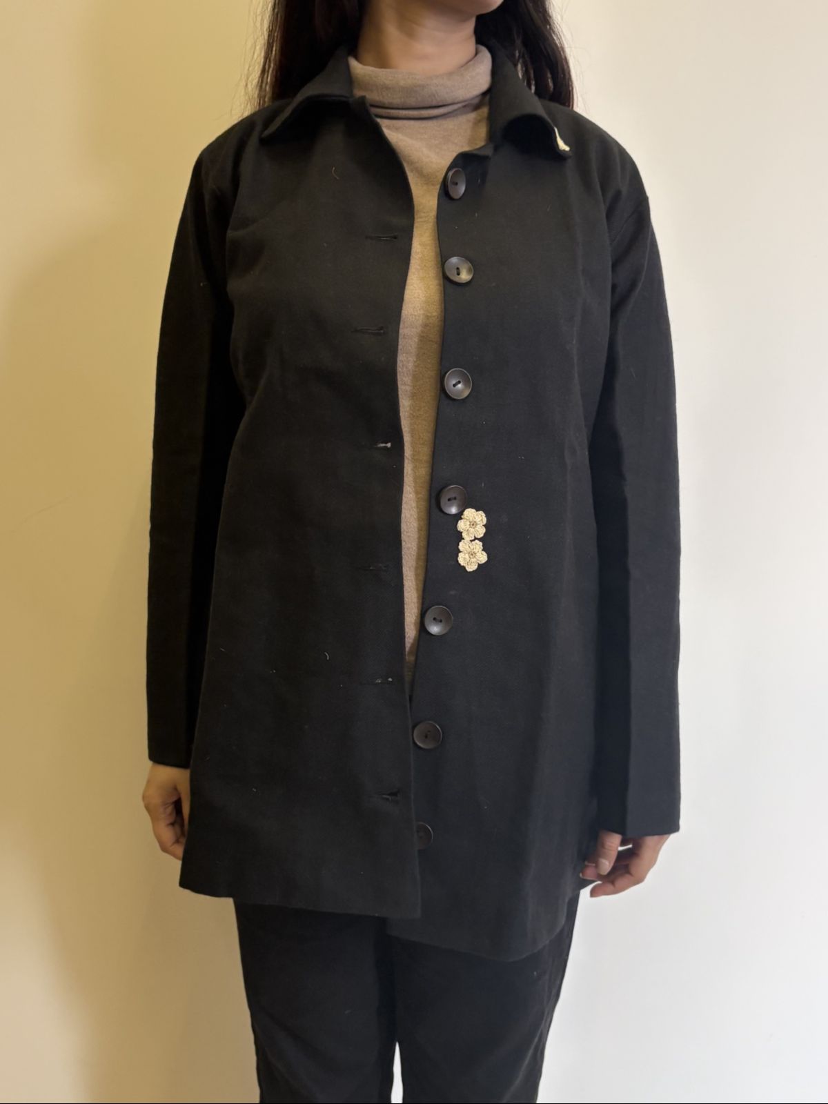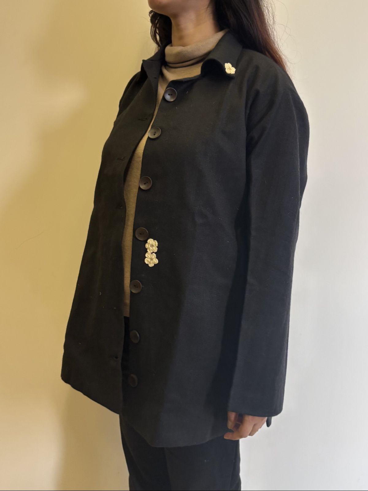 Elevate your everyday wardrobe with this expertly crafted woollen jacket that balances sophistication with comfort. The striking beige and black striped pattern creates visual interest while maintaining a refined aesthetic, perfect for layering across seasons. Cut to a precise 30-inch length with a straight silhouette, this piece offers versatile styling possibilities without compromising on structure. Artisanal crochet embellishments showcase meticulous hand-finishing, while natural wooden buttons and a breathable cotton lining demonstrate thoughtful material selection. Functional side pockets enhance practicality, and the quality construction ensures lasting wear. A testament to skilled Indian craftsmanship, this jacket delivers understated elegance with purposeful design details.