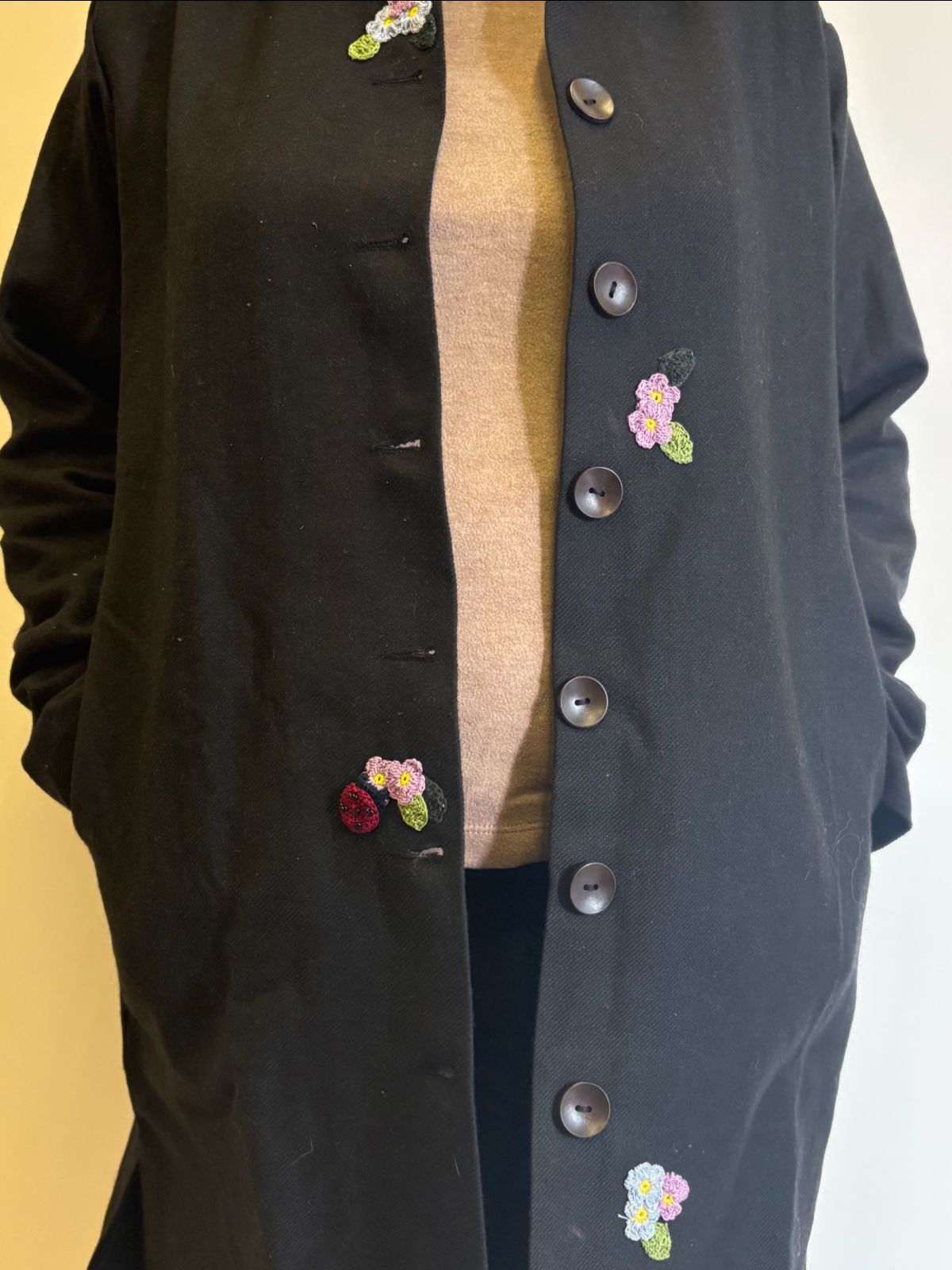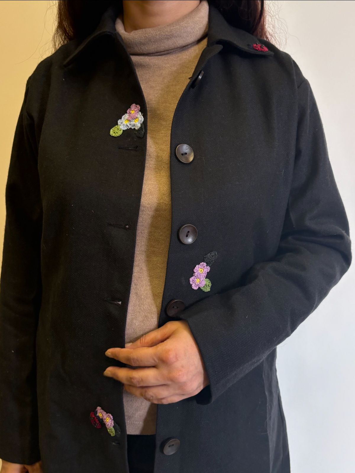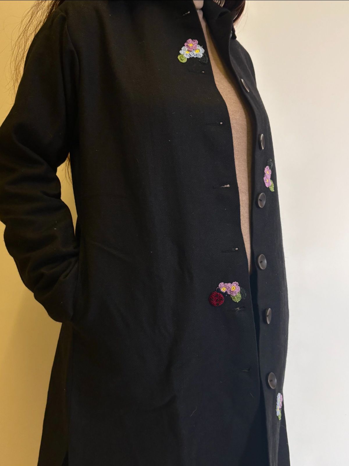 This refined black woollen jacket merges sophisticated tailoring with artisanal craftsmanship. Constructed from premium wool with a structured straight fit and 38-inch length, it delivers both visual elegance and practical warmth. The soft cotton lining ensures breathability and comfort against the skin, while hand-crocheted embellishments introduce subtle textural interest. Natural wooden buttons complement the jacket's understated aesthetic, and dual side pockets enhance functionality. Meticulously handcrafted in India, this piece serves as a versatile layering essential—equally at home in professional settings or casual occasions. A timeless investment that balances form with purpose.