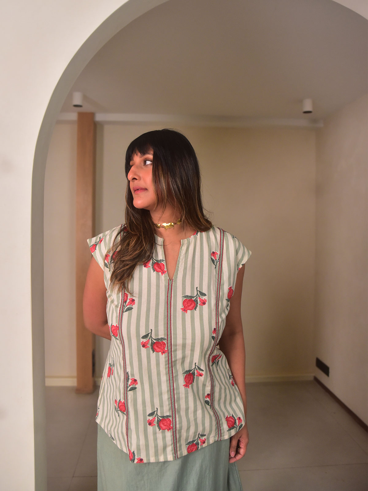Crafted in green stripes printed cotton, this relaxed sleeveless Anar top blends comfort with subtle detailing. Designed with back tie-ups for a cinched waist effect, it features three panels highlighted with delicate red thread stitches. Perfect for daytime outings, casual celebrations, or weekend wear. Pair it with our green cotton linen A-line skirt and flats for an easy, coordinated look.