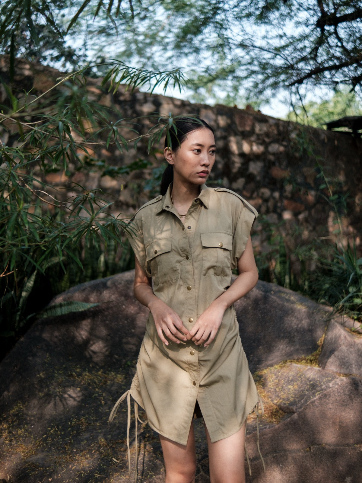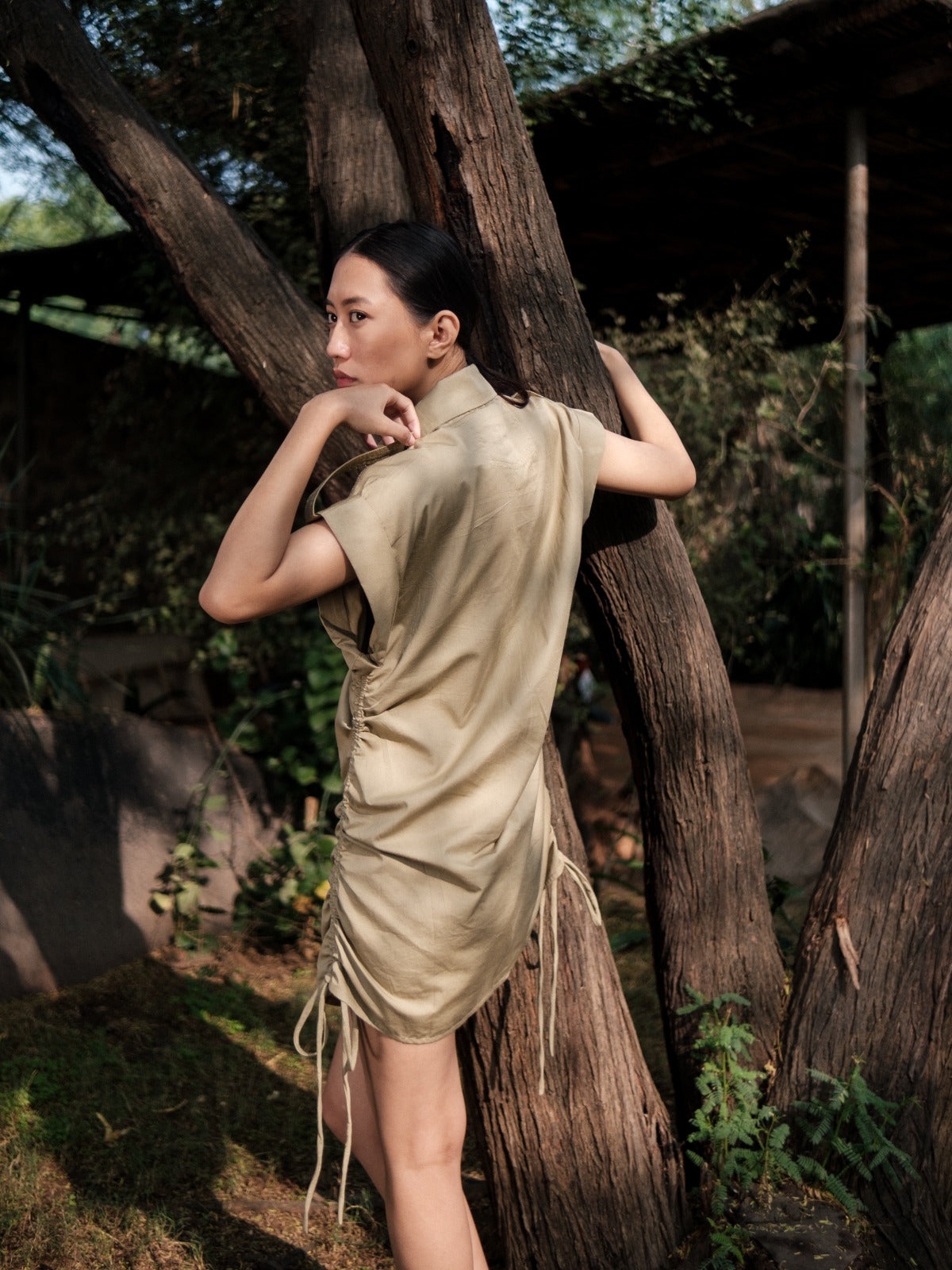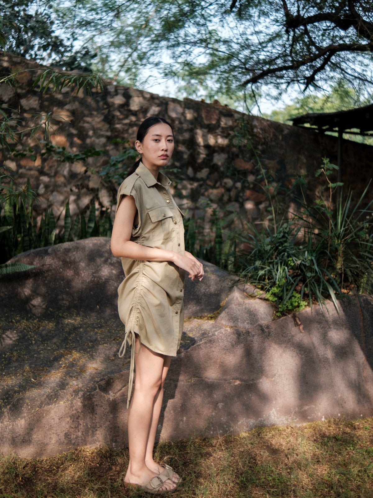 A versatile piece that doubles as a shirt or dress. Designed with elegant side gathers for a touch of sophistication, balanced by patch pockets for a street-style edge. Comfortable yet chic, it seamlessly blends polished detailing with modern functionality—ideal for both casual wear and dressed-up outings.