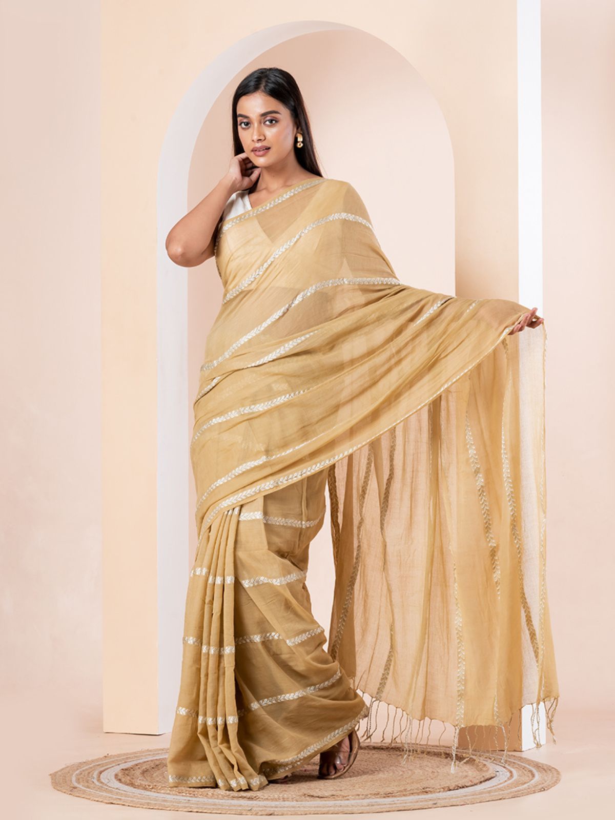 Hazelnut Pure Cotton Saree With Zari Stripes | Yellow Ochre