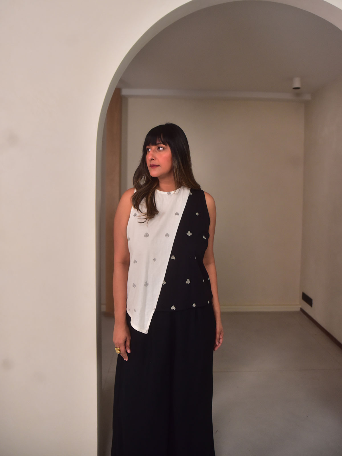 Theis top is a half-and-half sleeveless silhouette cut in exclusive white and black playing cards printed cotton. Designed with an asymmetric hem, closed neckline, and a subtle back slit with hook-and-eye opening, it offers comfort with a contemporary edge. Ideal for creative outings, casual evenings, or day-to-night styling. Pair it with our Juno pants and minimal accessories for a refined statement.