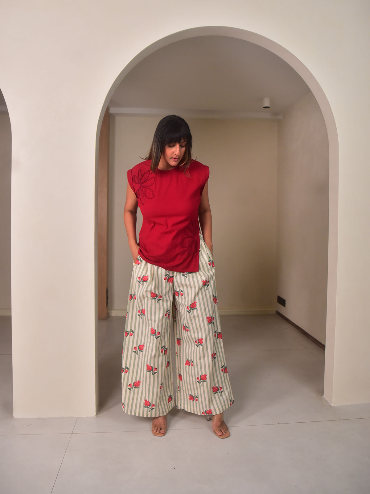 This striking set features a red dyed cotton linen top with a closed neckline, cinched waist, high side slit, and handcrafted maroon floral cording details. It is paired with high-waisted flared pants cut in green stripes printed cotton, designed with side pockets, a front button and zipper opening, and elastic at the back for comfort. Perfect for festive gatherings, celebrations, or statement daywear. Style with bold earrings and neutral footwear to complete the look.