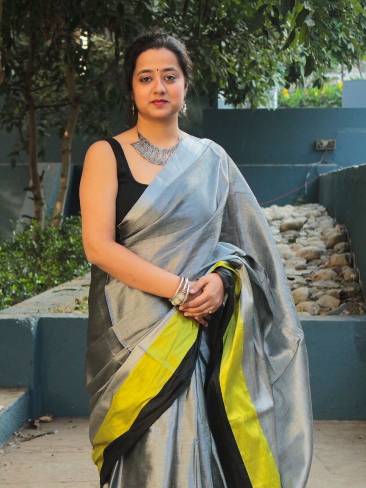 Steel grey handwoven Mul Tissue cotton saree with yellow and black borders. Perfect for evening celebrations or date nights, this saree blends elegance with artisanal craftsmanship. Includes a running blouse piece and takes 48 hours of meticulous handwork to create.