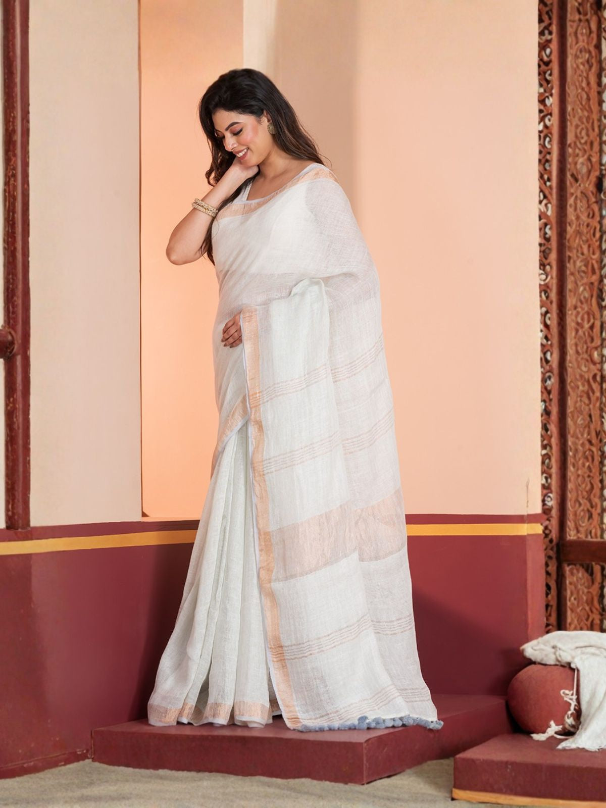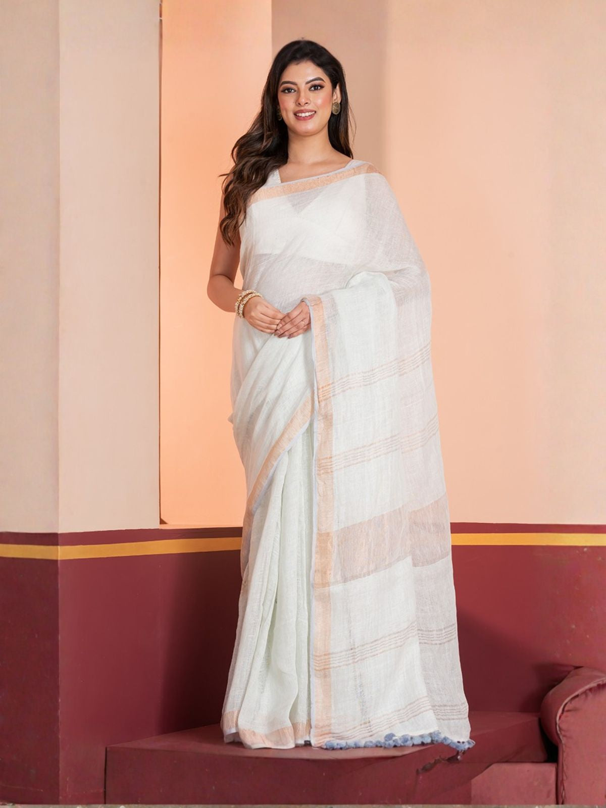 Introducing our Handloom Saree, a beautiful piece of art that celebrates traditional weaving techniques and exquisite craftsmanship. Each saree is handcrafted by skilled artisans of Phulia, West Bengal , making each piece unique and special. Made from linen , this pastel solid saree drapes beautifully and is comfortable to wear all day long. Our Handloom Saree is perfect for any occasion, from a casual day out to a special event. The pastel color and minimal design makes it a stunning addition to any wardrobe, adding a touch of elegance and sophistication to any outfit.