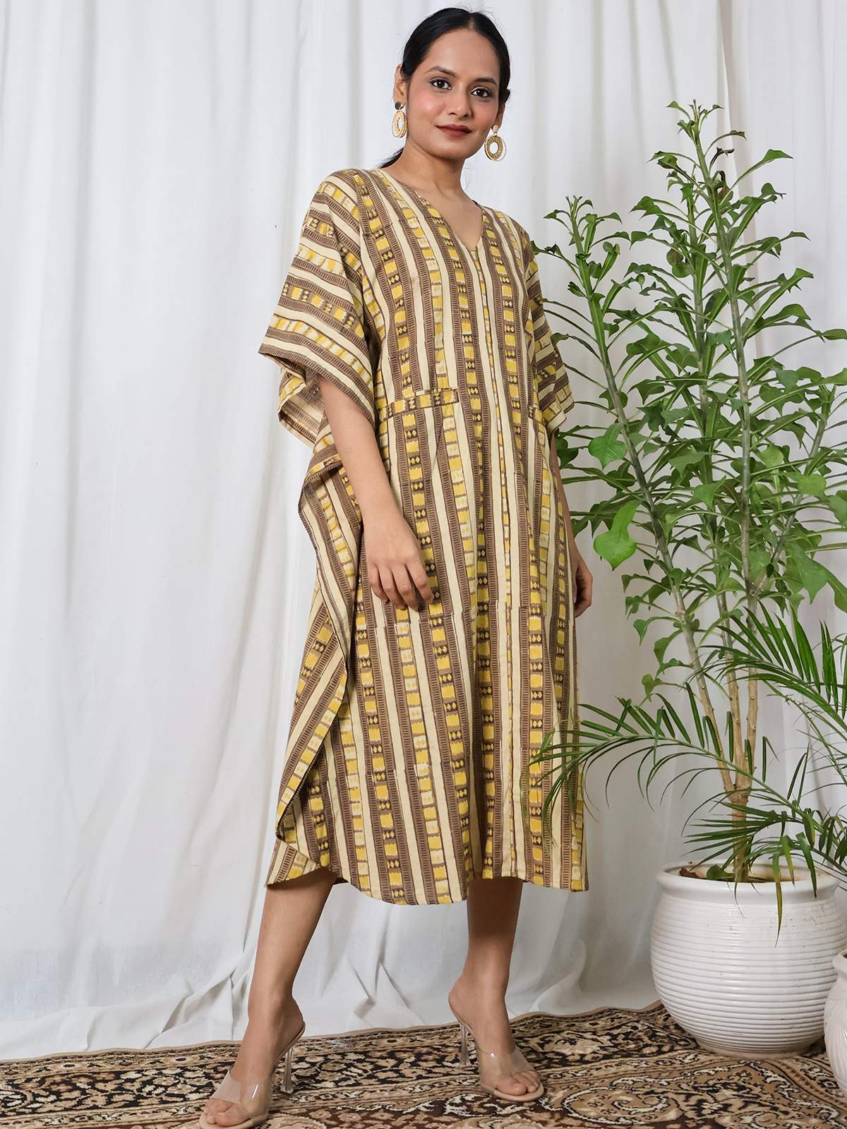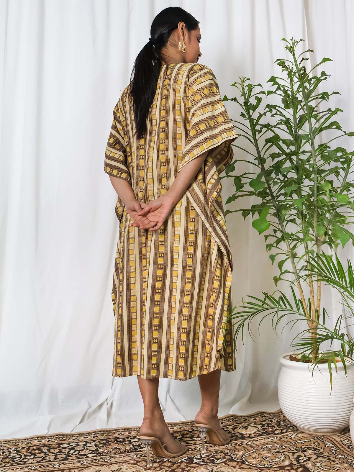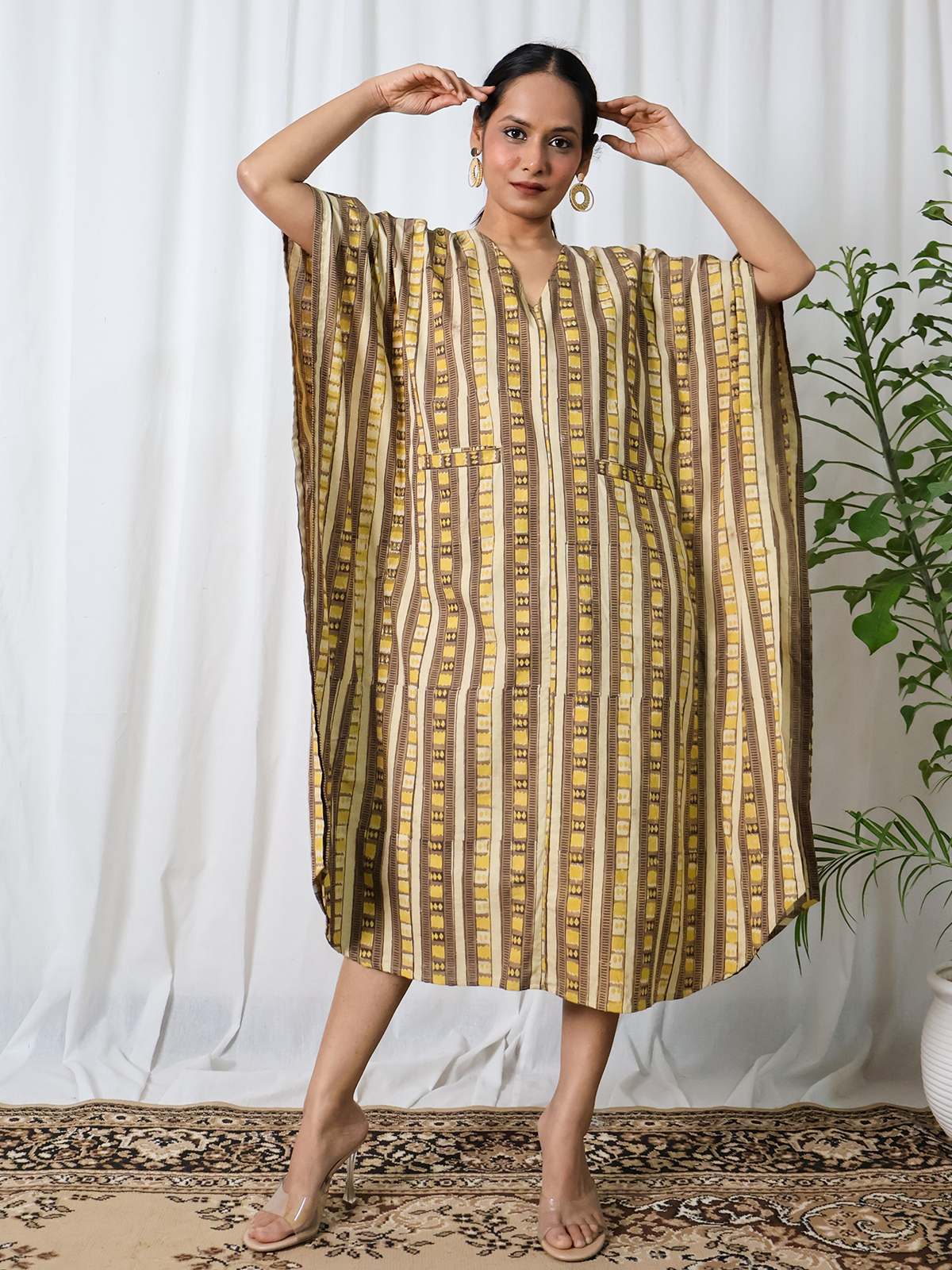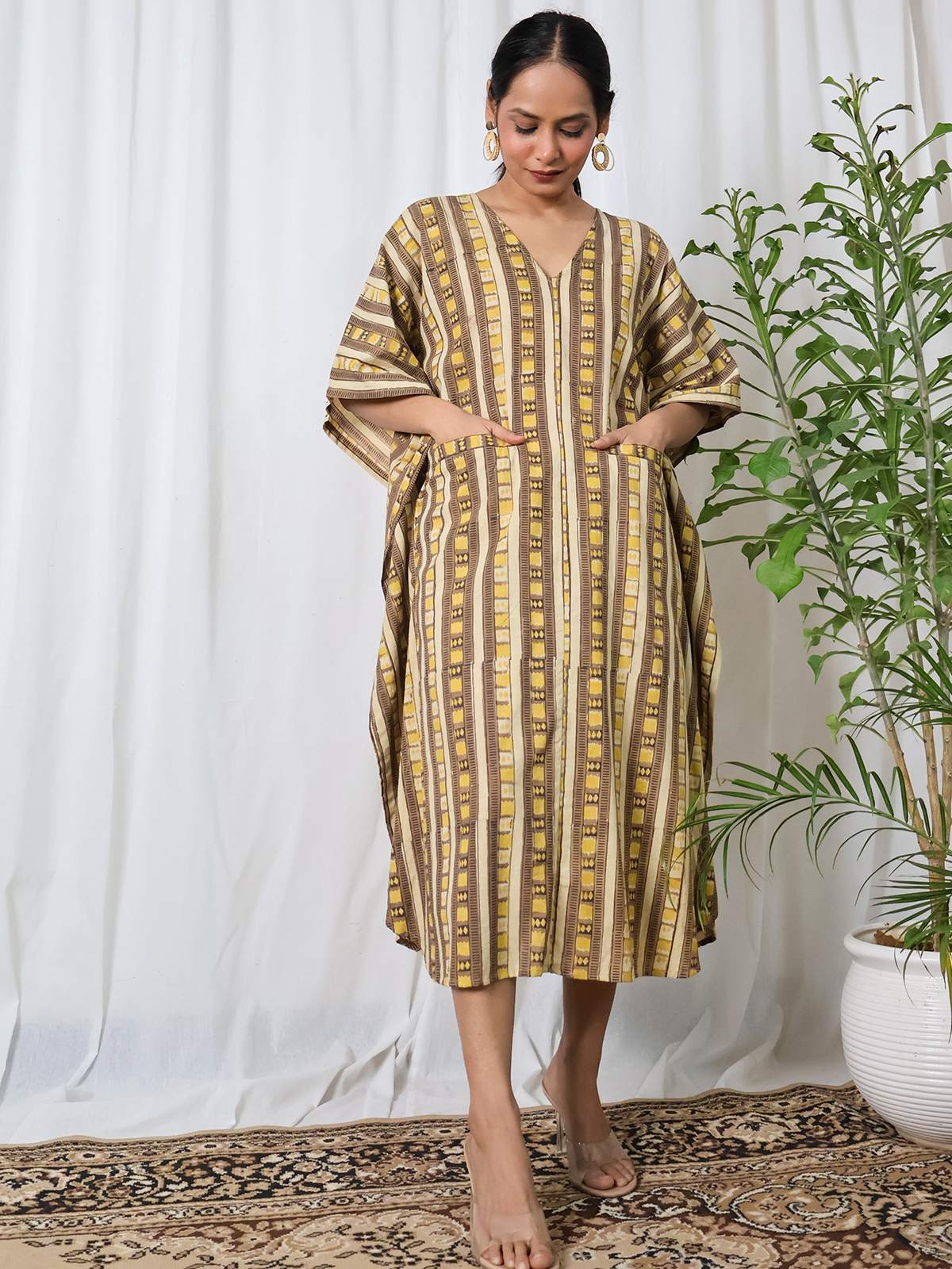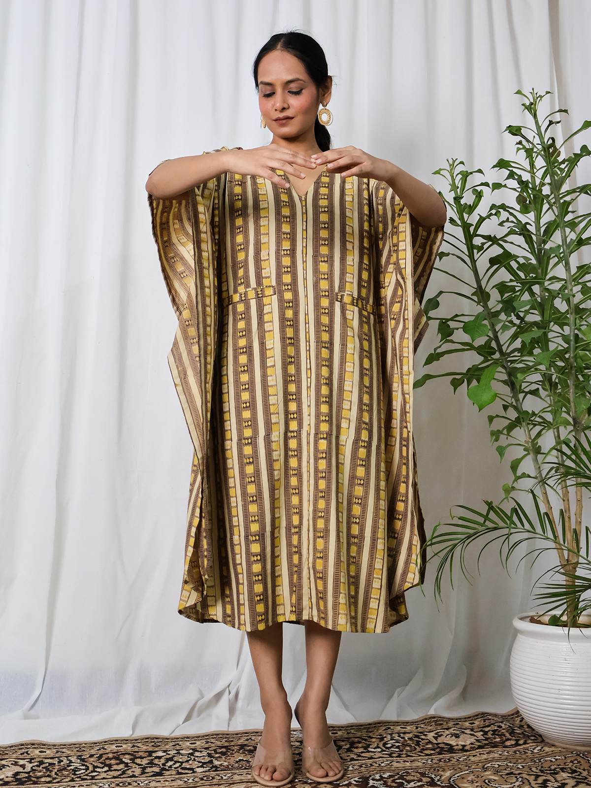 A beautiful Kaftan silhouette stitched to flatter your curves, with a V-neckline, and front welt pockets. This dress is love at first sight and will surely be your new favorite. Pair the dress with chic jewelry, heels to style it up and a clutch for an elegant look. The fabric is an Ajrakh HandBlock print sourced from Jaipur and also stitched by our skilled artisans in Jaipur.