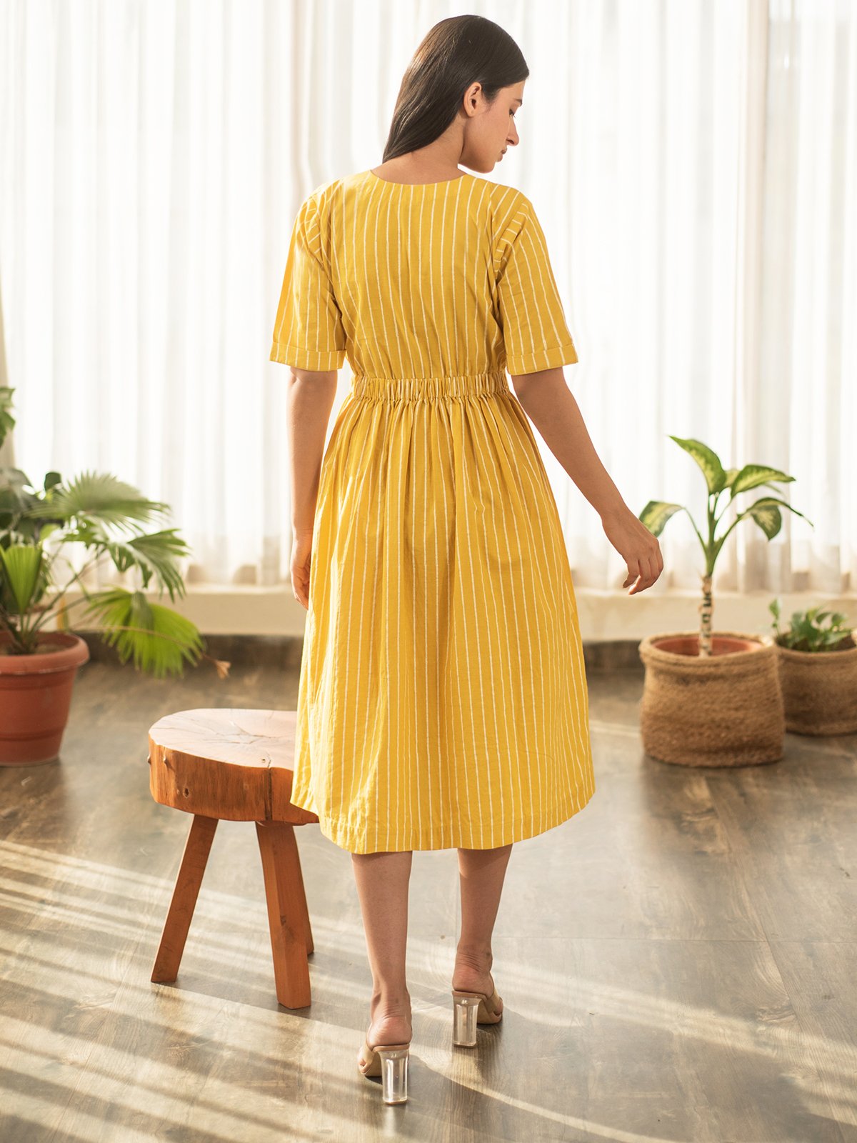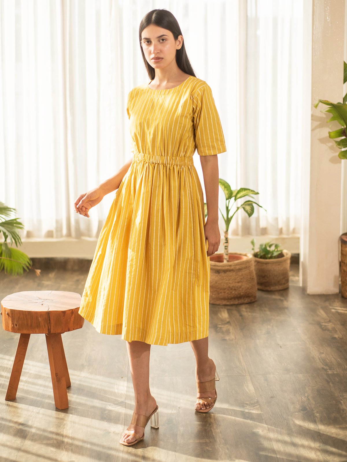 Made from soft cotton, this yellow dress features hand block printed stripes and a comfortable elastic waist. The relaxed silhouette and thoughtful stripe play give it a cheerful, effortless vibe.