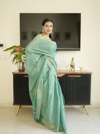 Green Linen Silk Saree With Zari Border