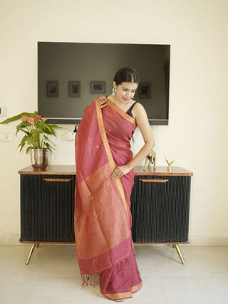 Red Linen Silk Saree With Zari Border