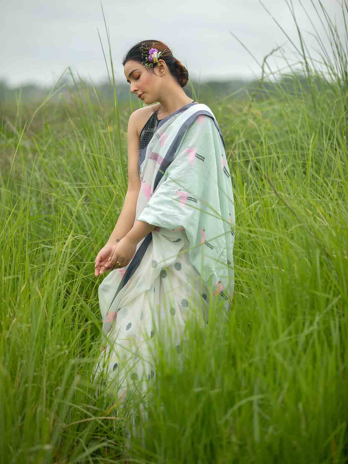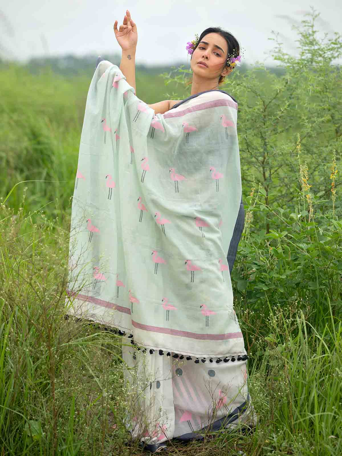 This is a handwoven cotton saree by using Jamdani technique. This is a white coloured saree with small buti oll over the body and flamengo motifs on the pallu.
