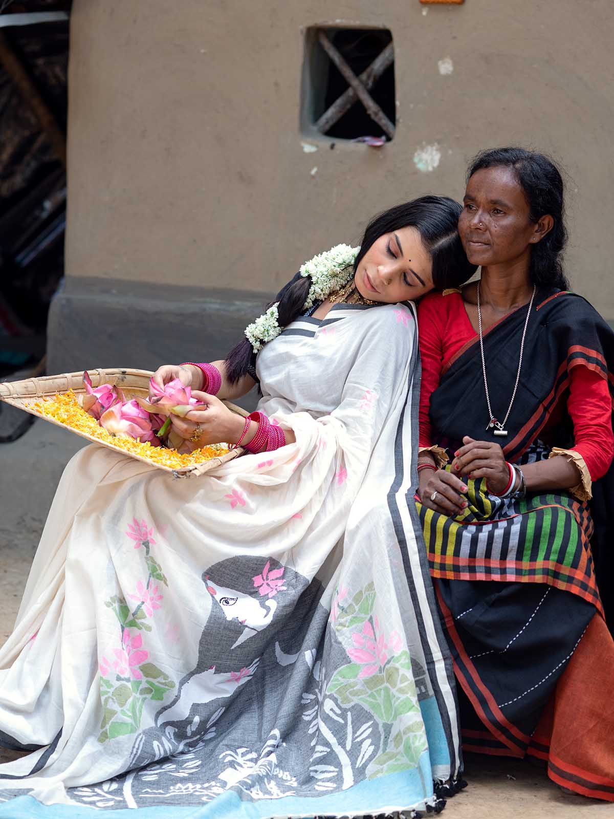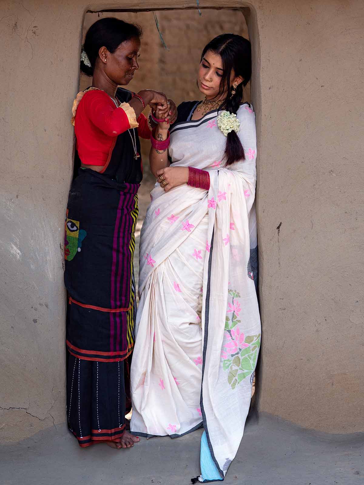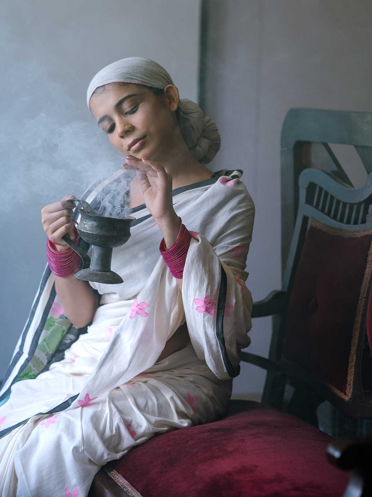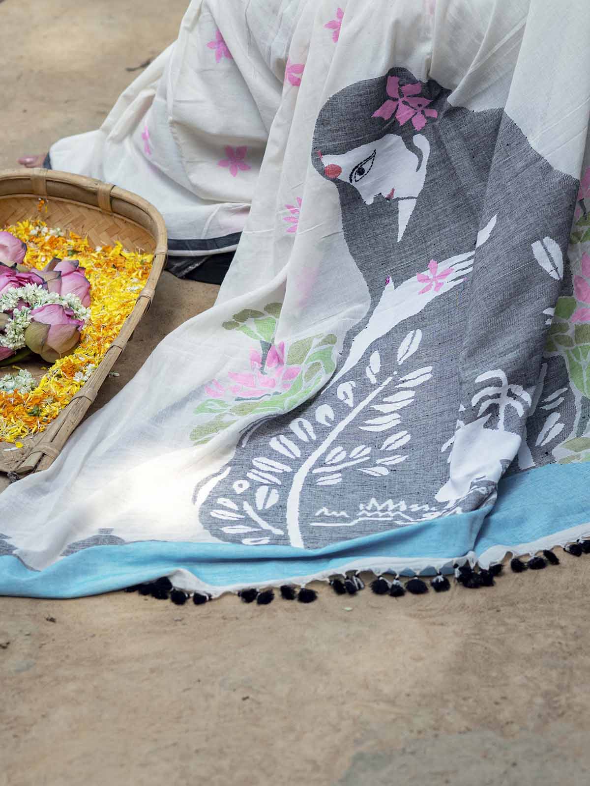This is a handwoven cotton saree by using Jamdani technique. This is a peach saree with pink flowers all over the body and a Gouri motif on the pallu.