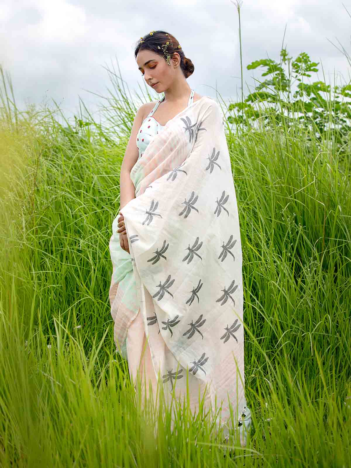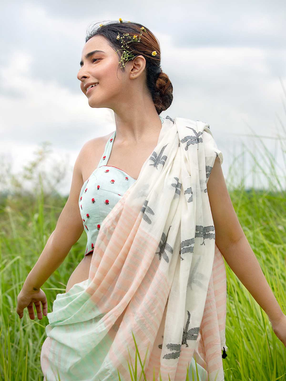 This is a handwoven cotton saree by using Jamdani technique. This is an offwhite coloured saree with green and peach stripes all over the body and dragonfly motifs on the pallu.