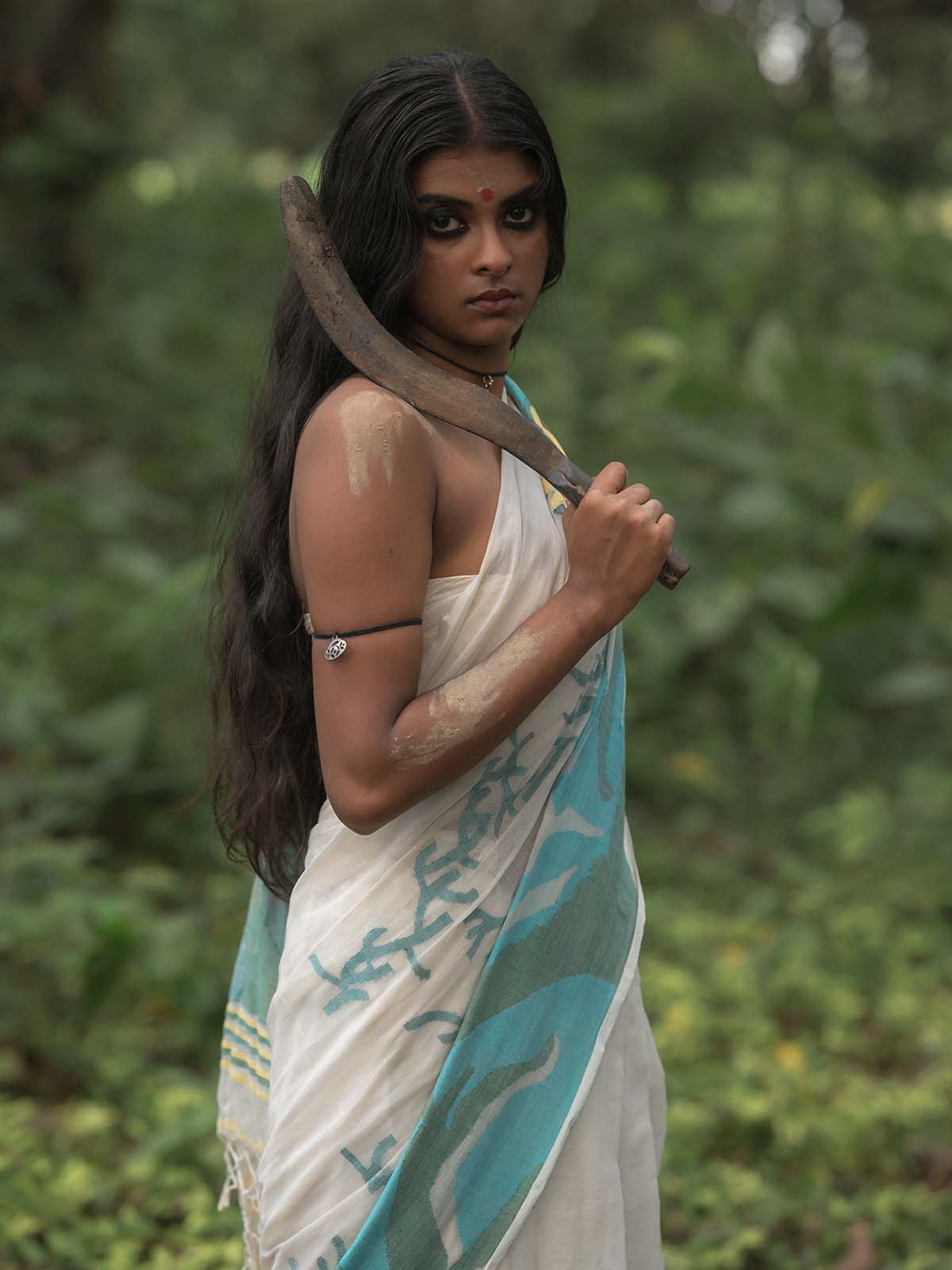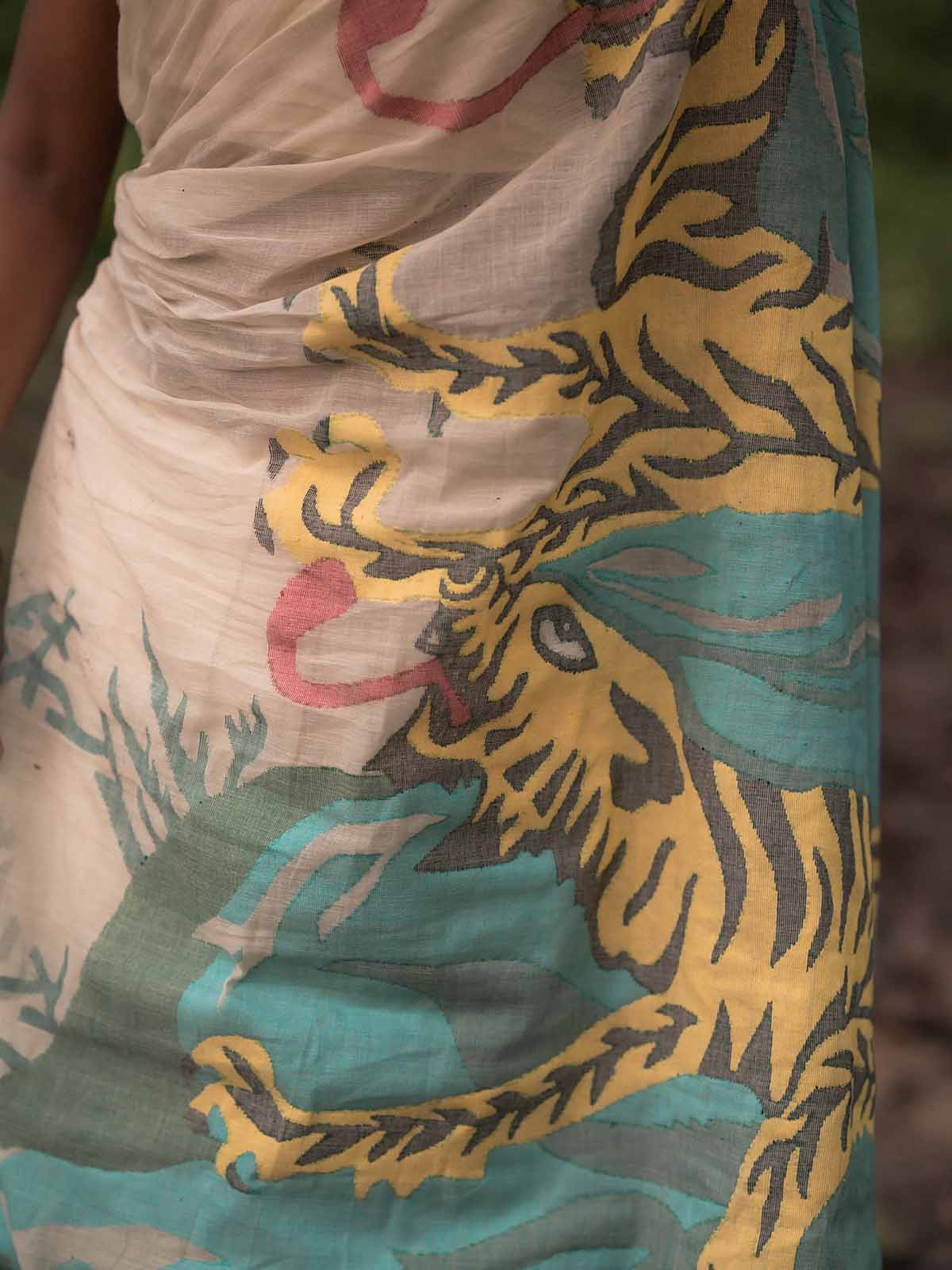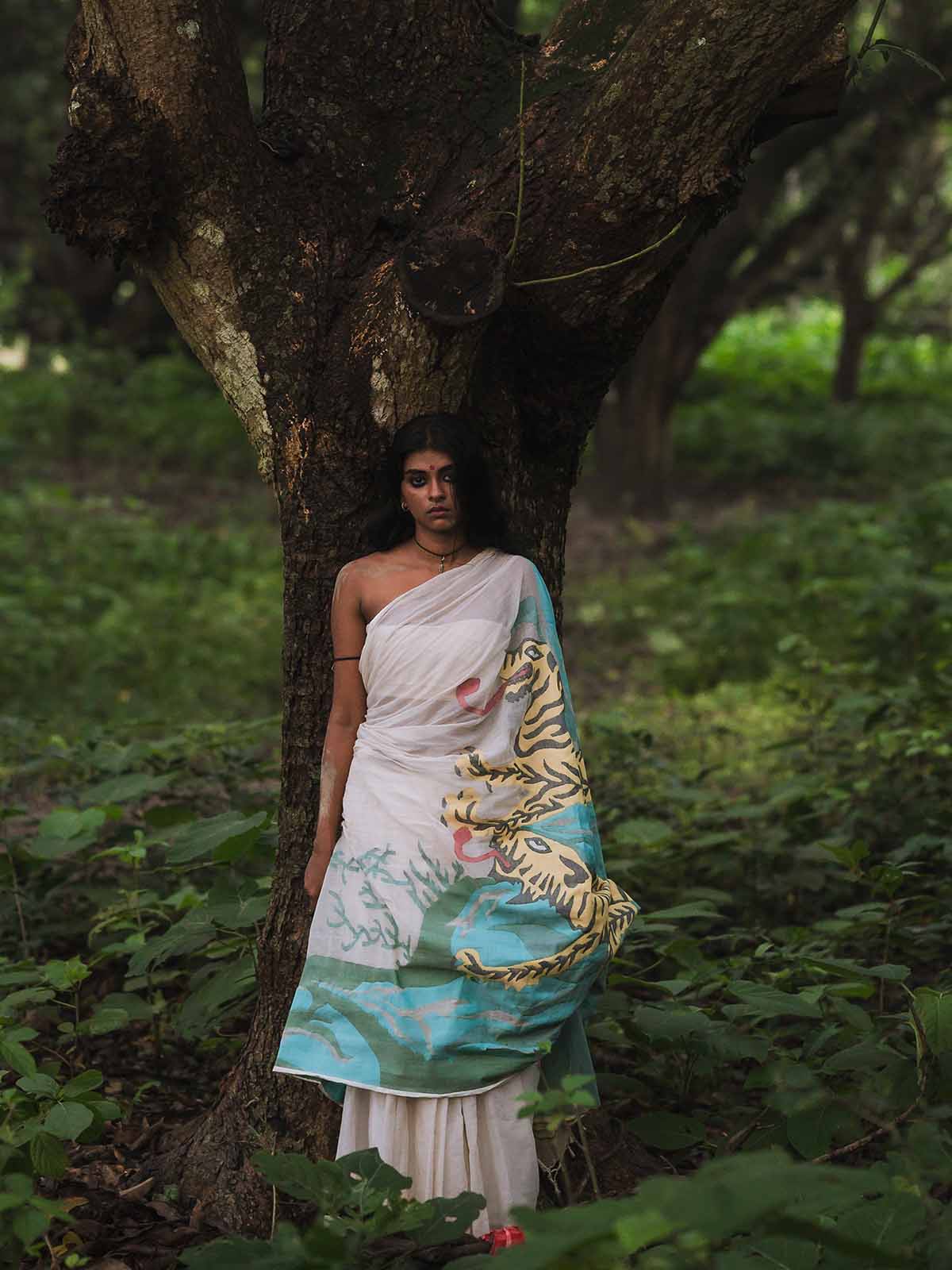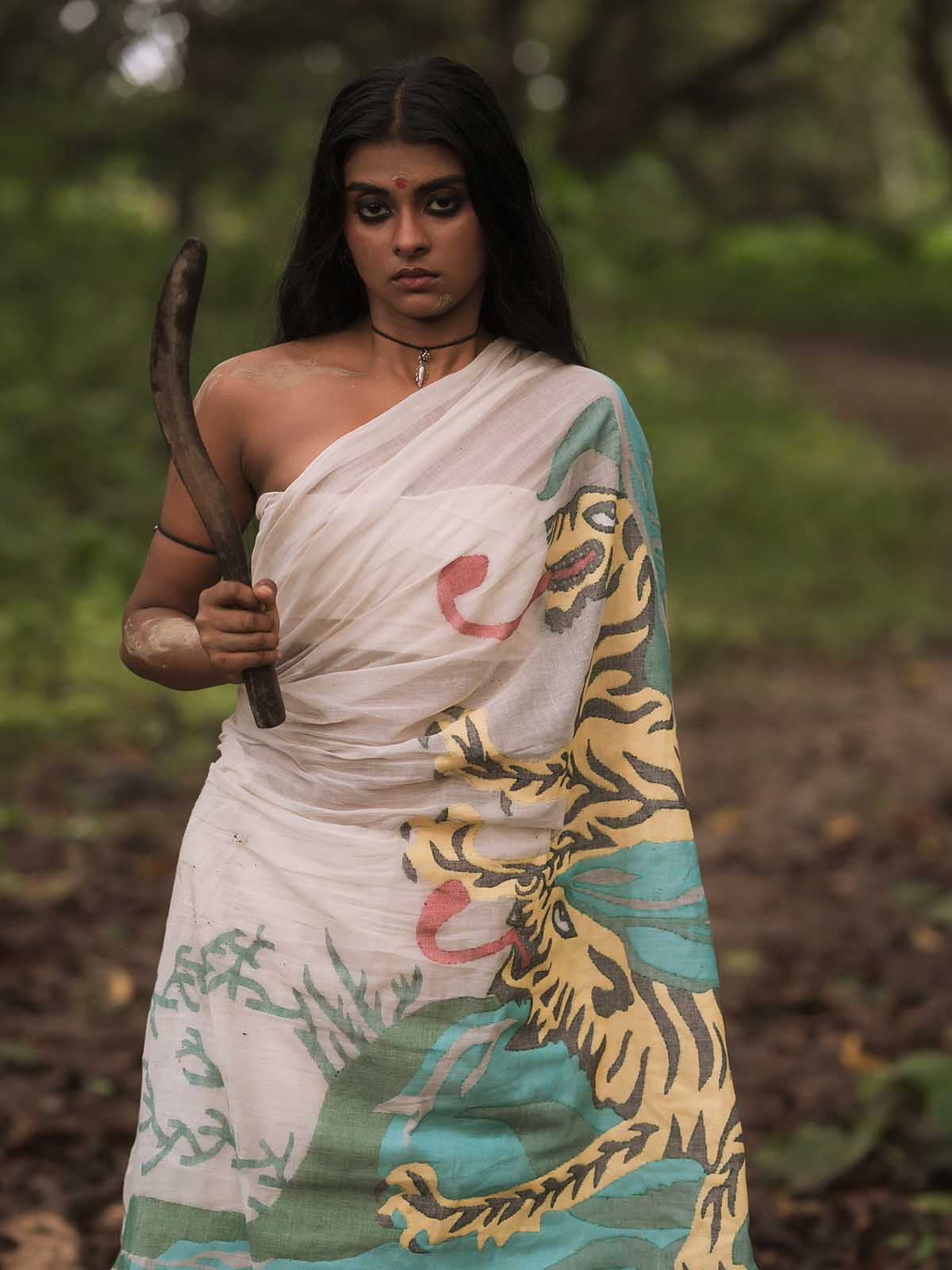 This is a handwoven cotton saree by using Jamdani technique. This is a white saree with sundarban patachitra inspired tiger in a jungle motif on the pallu.