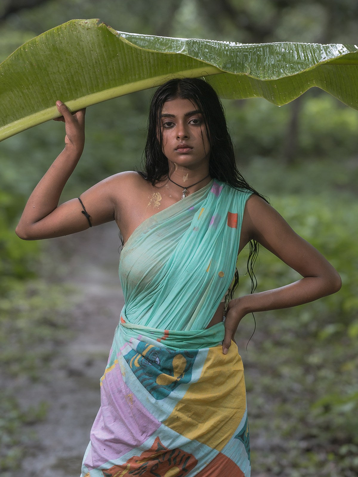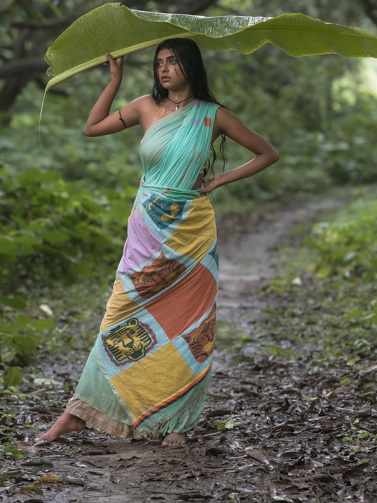 This is a handwoven cotton saree by using Jamdani technique. This is a blue saree with sundarban patachitra inspired Tiger mask motif on the pallu and colourful shapes adorning the body.
