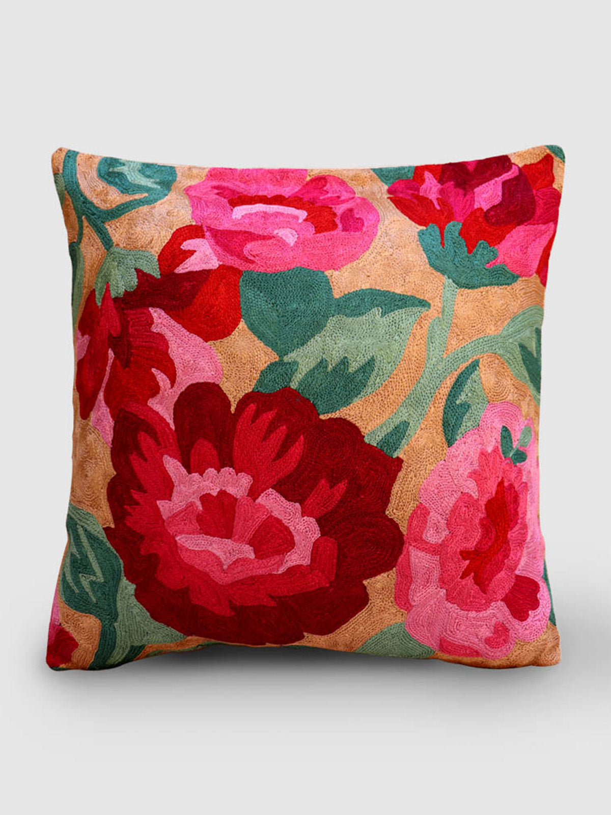 An elegant mellow cream coloured cushion cover hand-embroidered with the graceful hollycock blossom. Made by talented embroidery artisans using chain stitches with a special hook called aari, this cushion cover can be the a conversation starter in your home. The base material is a mill dyed cotton fabric called Dasoot and the embroidery is done with silk threads of multiple shades. Two wooden buttons secure the cushion.