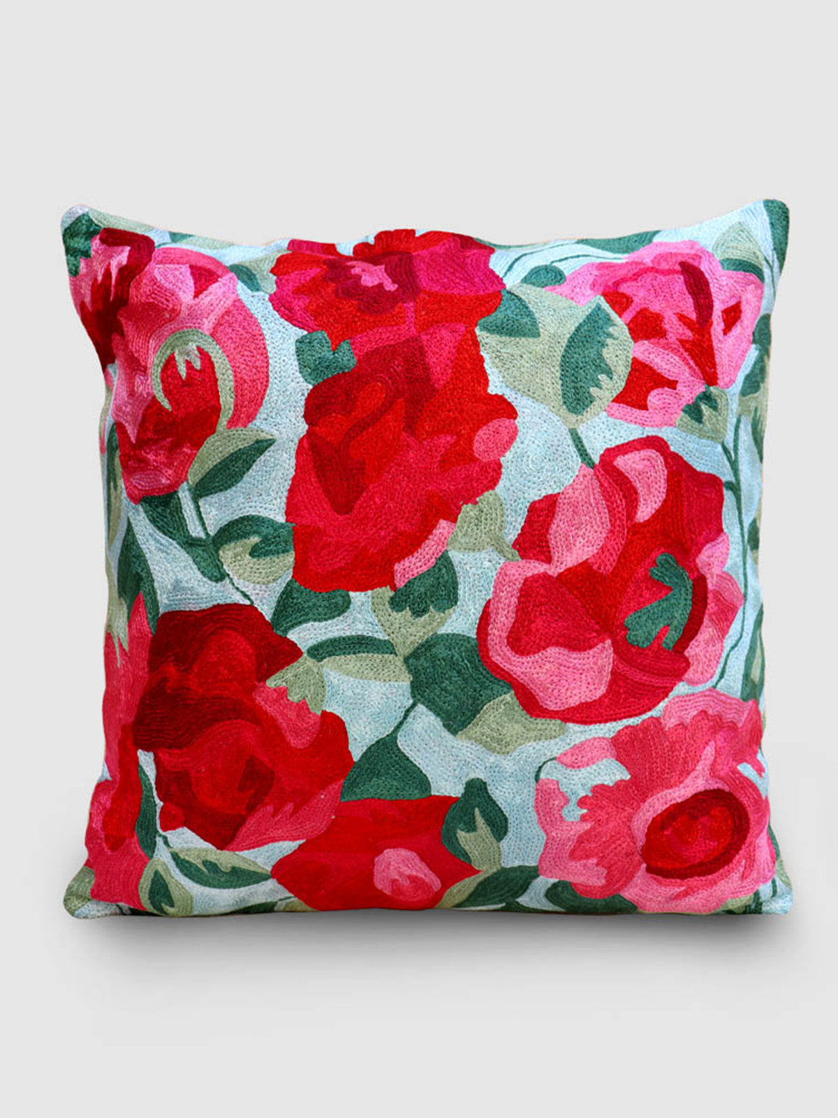 An exquisite arctic blue coloured cushion cover hand-embroidered with the beautiful nargis flowers. Made by talented embroidery artisans using chain stitches with a special hook called aari, this cushion cover can be the a conversation starter in your home. The base material is a mill dyed cotton fabric called Dasoot and the embroidery is done with silk threads of multiple shades. Two wooden buttons secure the cushion.