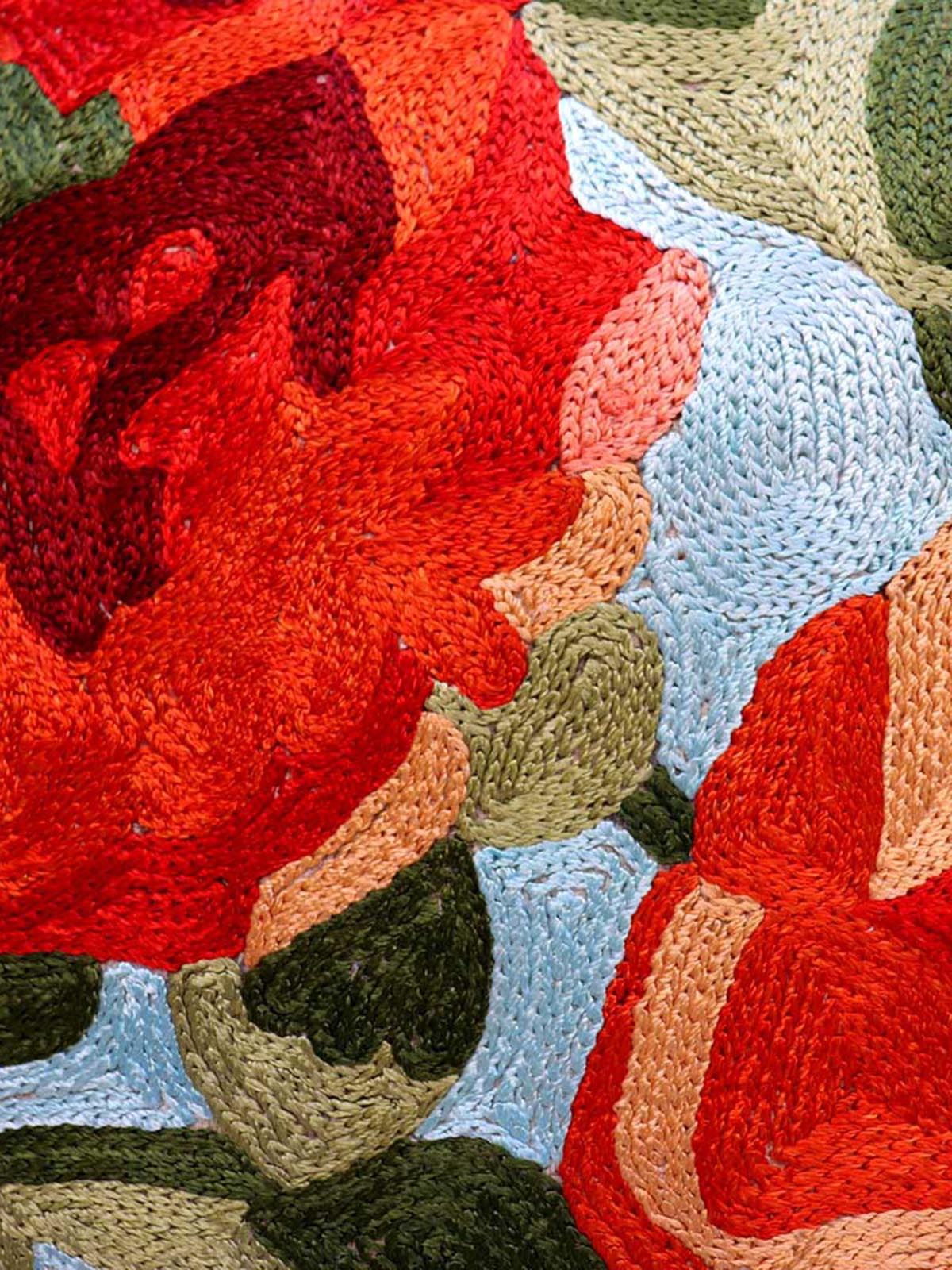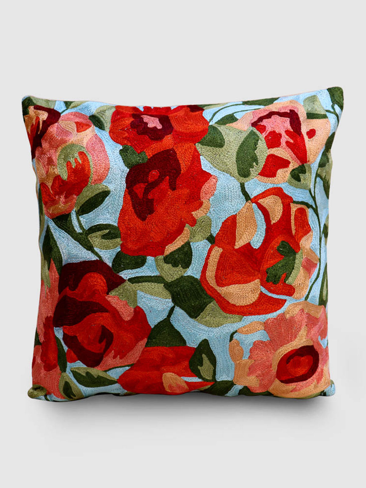 An exquisite sky-blue coloured cushion cover hand-embroidered with the beautiful nargis flowers. Made by talented embroidery artisans using chain stitches with a special hook called aari, this cushion cover can be the a conversation starter in your home. The base material is a mill dyed cotton fabric called Dasoot and the embroidery is done with silk threads of multiple shades. Two wooden buttons secure the cushion.