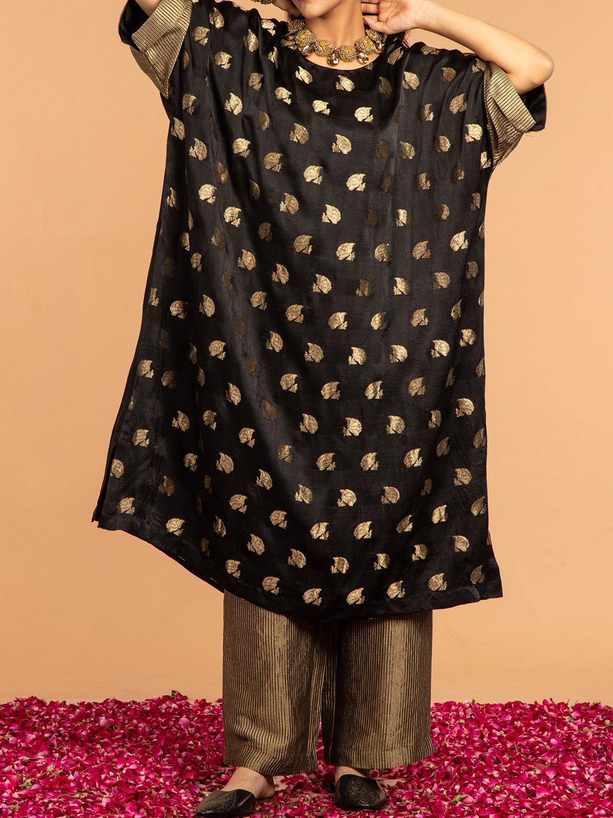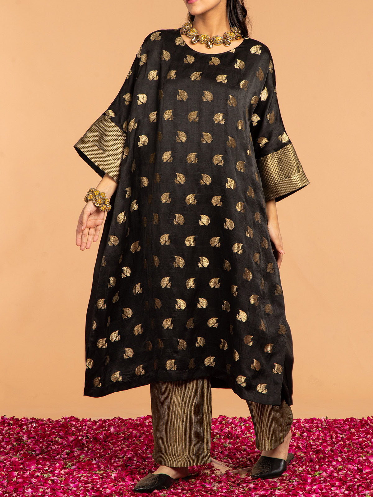 The Kaftan, crafted from sumptuous Mashru silk, features intricate Gulab Boota patterns and striking stripes on the sleeves. Its elegant design is enhanced by a practical placket at the back, ensuring effortless wear. Paired with handloom zari pants in black, this ensemble offers a chic, coordinated look. Ideal for both casual and formal events, this kaftan delivers a blend of traditional charm and contemporary style.
