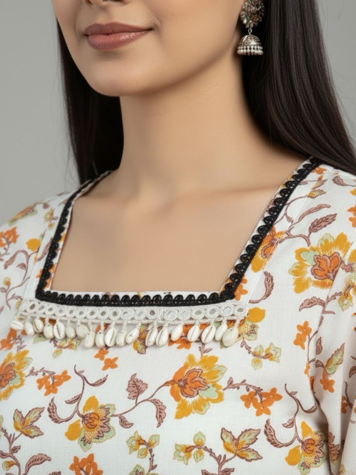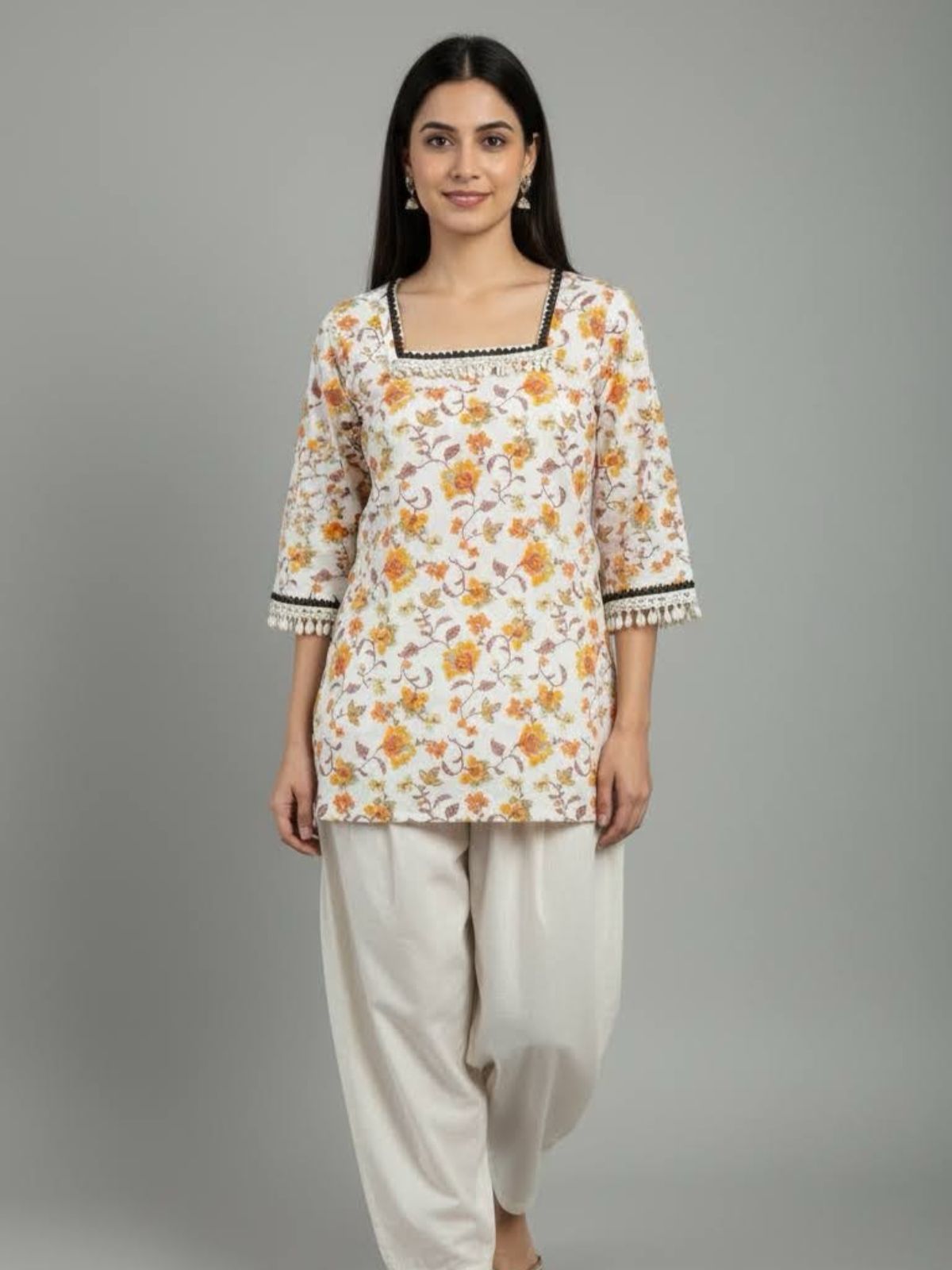 Crafted from a lightweight, breathable cotton, this vibrant kurti features a beautiful all-over floral print in warm yellow and orange tones against a crisp white background. It boasts a flattering square neckline and three-quarter sleeves, both trimmed with stylish black lace and delicate pom-poms. This piece effortlessly blends traditional charm with modern freshness, making it a perfect addition to your daytime casual or festive wardrobe.