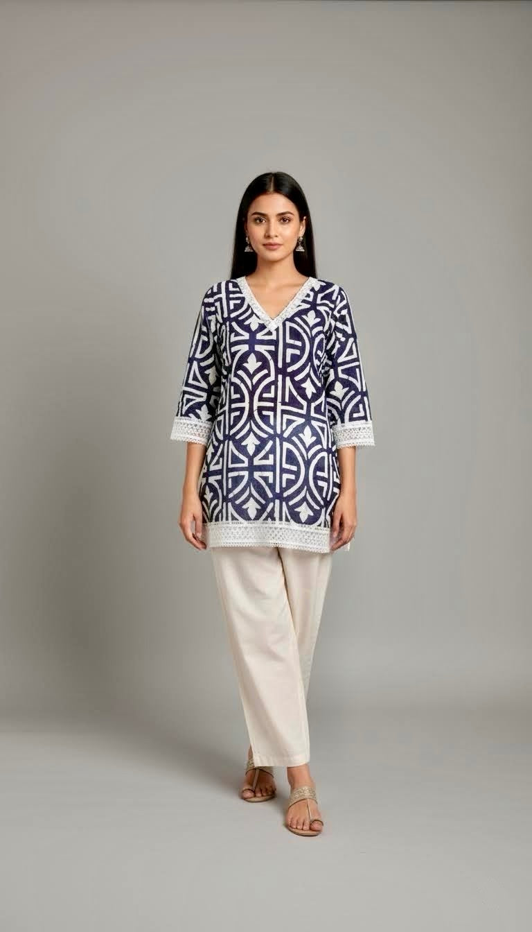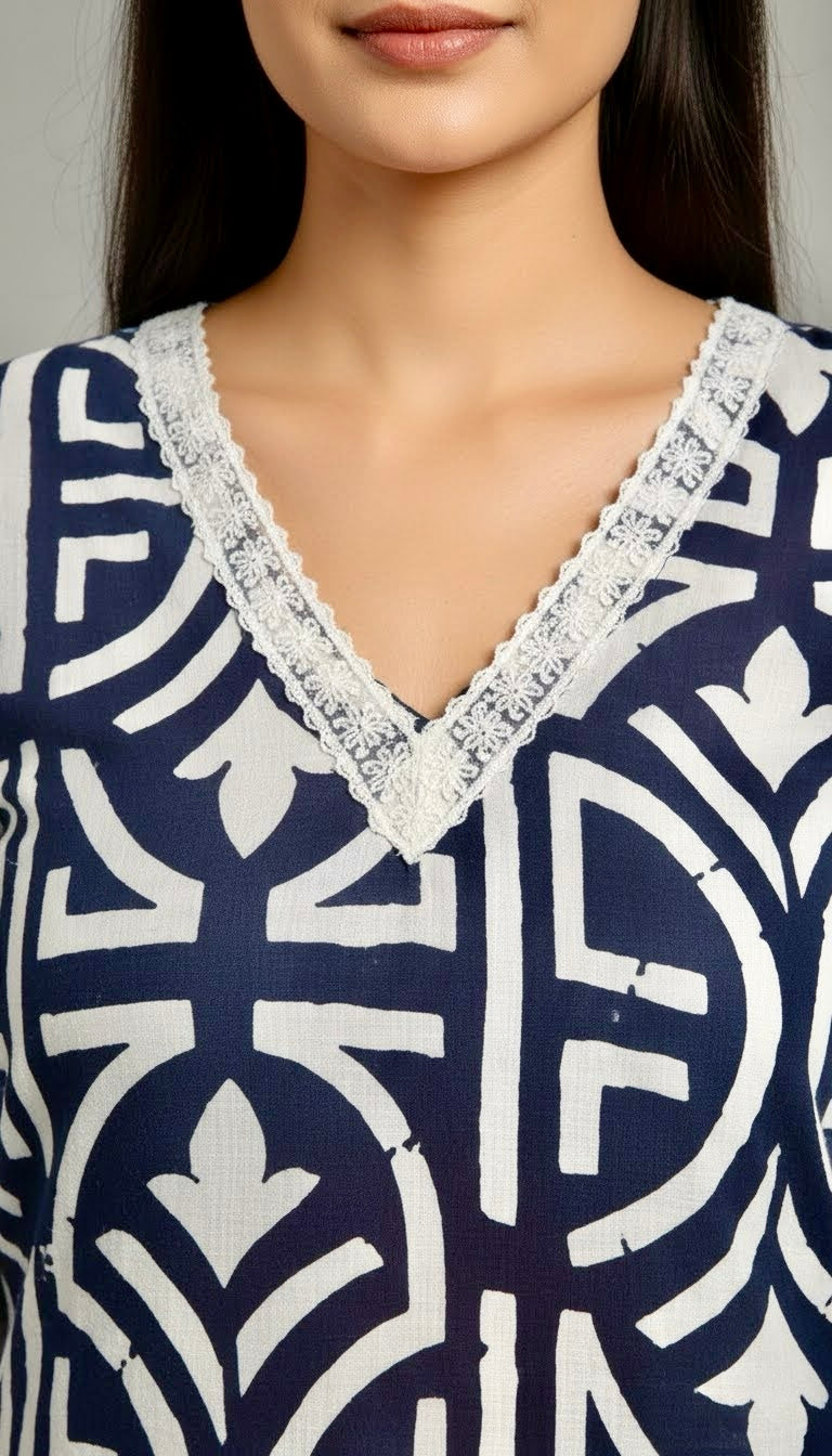 Crafted from soft, breathable cotton, this kurti features a striking navy blue base adorned with a bold white geometric print. It boasts a flattering V-neckline and three-quarter sleeves, all elegantly finished with delicate white lace trim on the neck, cuffs, and hem. This straight-cut piece is both modern and comfortable, perfect for adding a touch of sophisticated flair to any casual or festive ensemble.