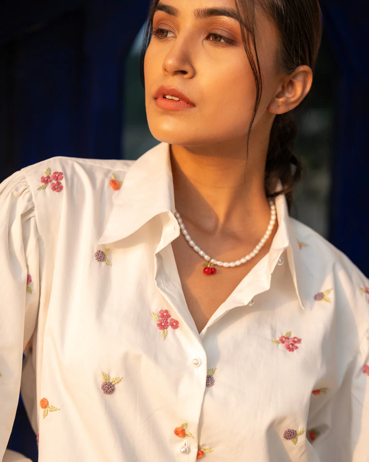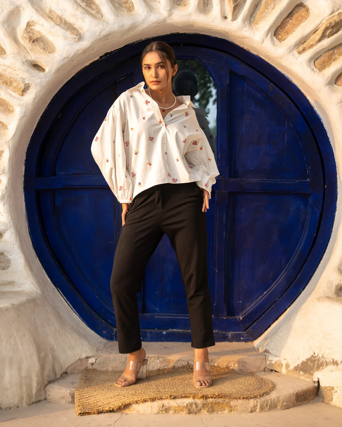 She is the perfect combination of style and comfort. With its relaxed fit and soft cotton material, it guarantees a comfortable wear. The intricate embroidery on the shirt adds a touch of elegance, making it ideal for both smart and casual occasions.