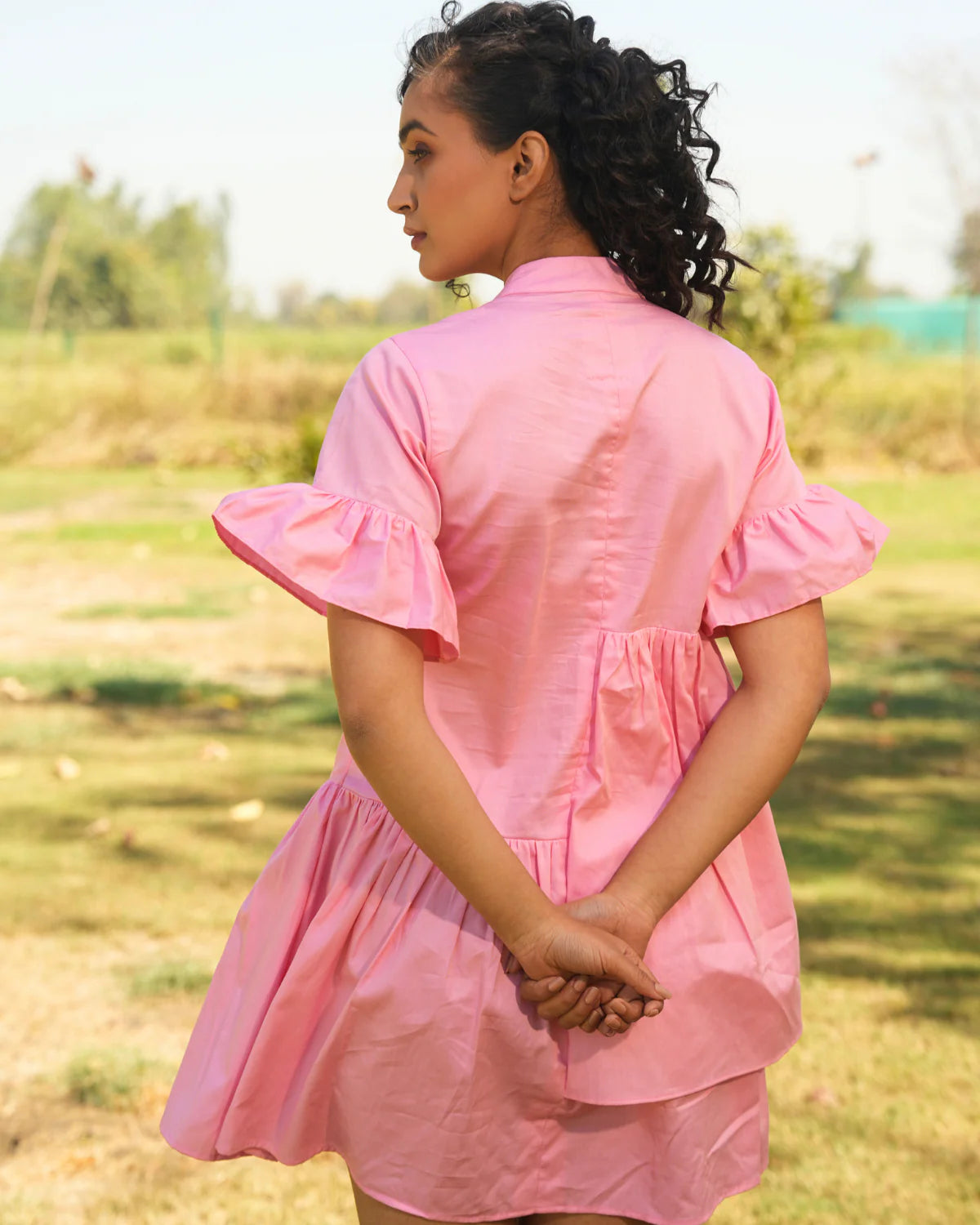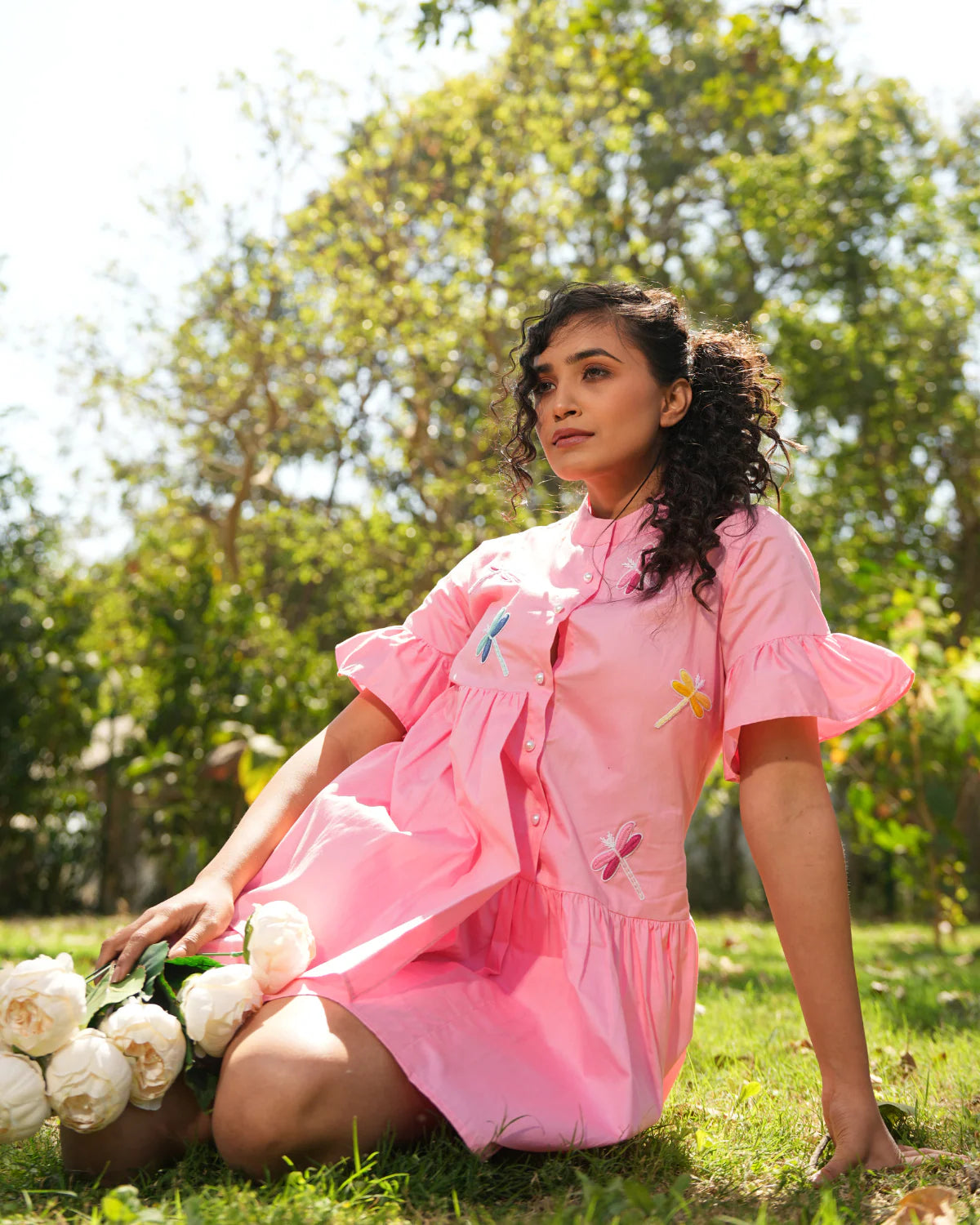 She is the layered dress with chirpy vibes and a convenient pocket. The intricate embroidery adds charm and whimsy to this must-have piece. Perfect for any occasion, it's sure to be your new go-to! Layered mini silhouette with soft movement Relaxed, comfort fit with hand embroidery Pearl button front for subtle sophistication Hidden side pocket for seamless functionality Short flounce sleeves for a delicate accent Clean band collar for a modern finish
