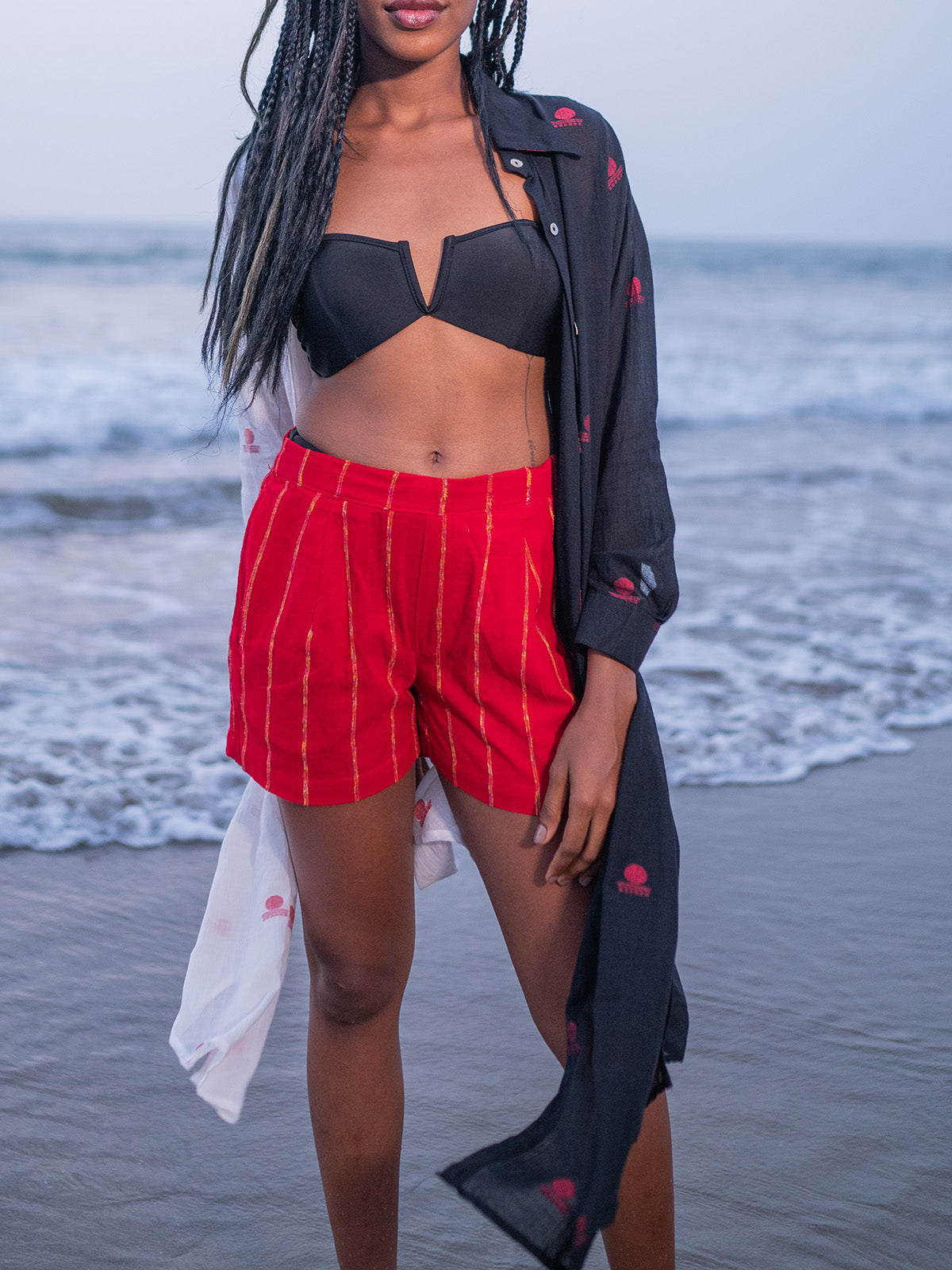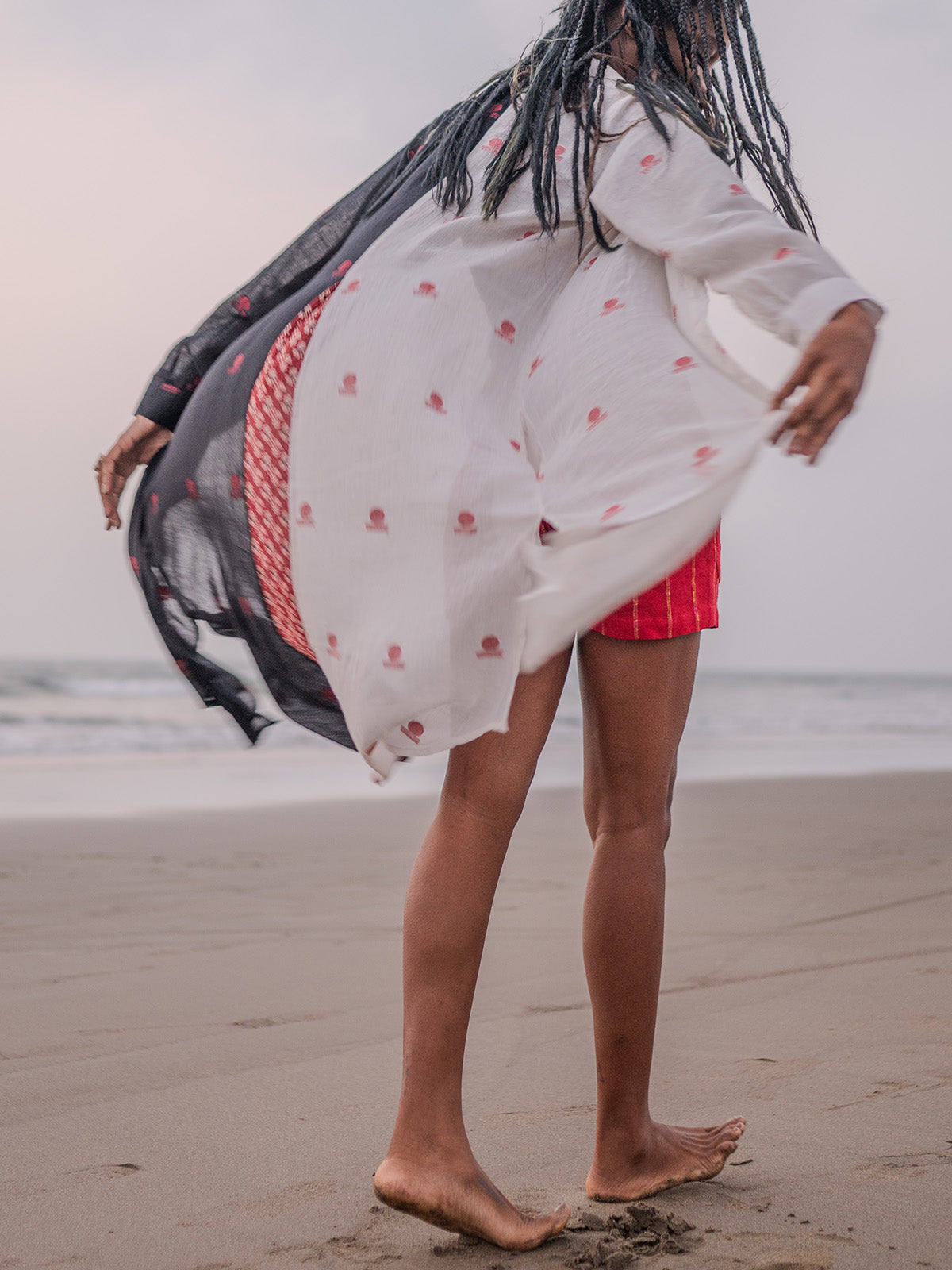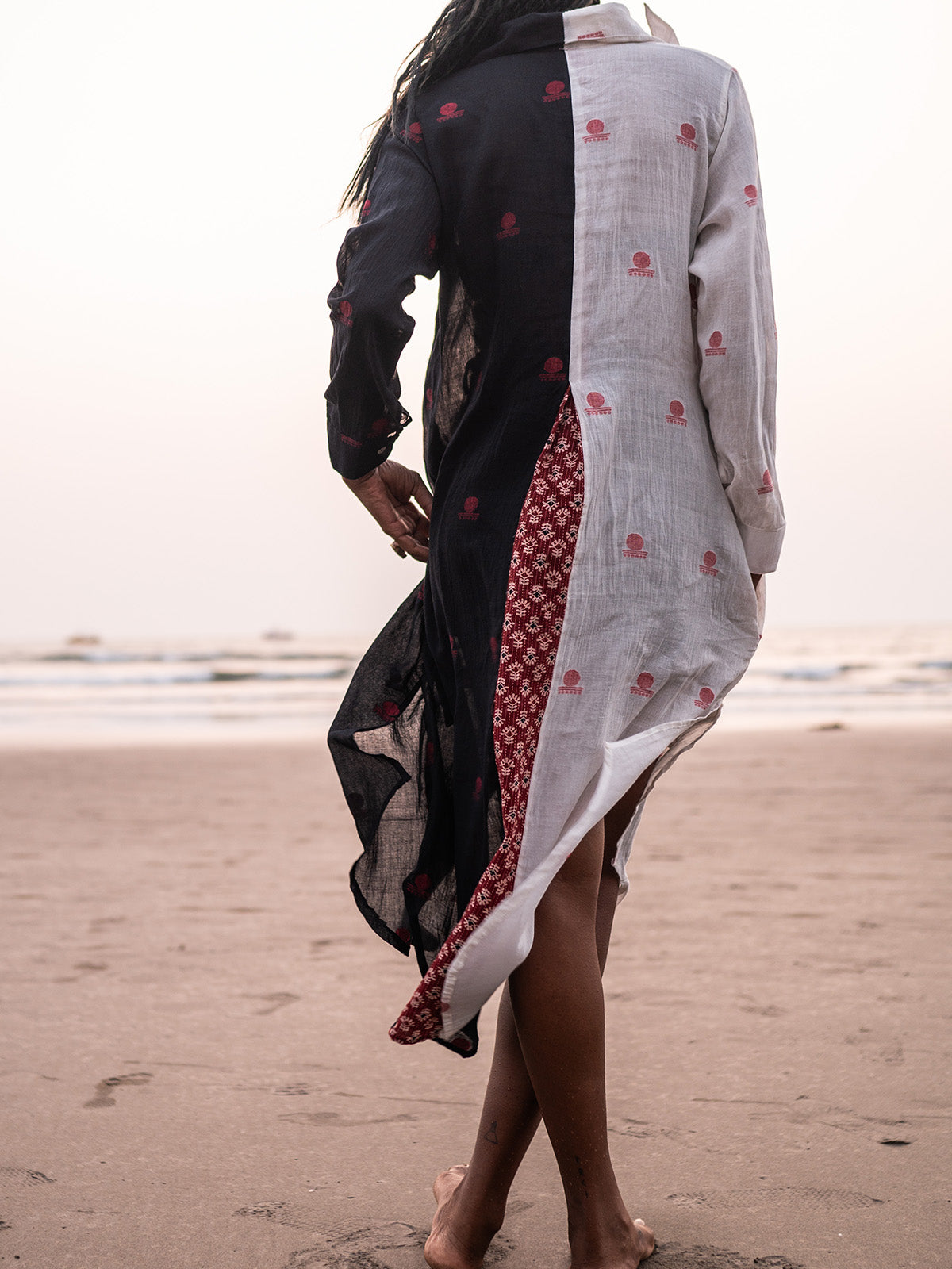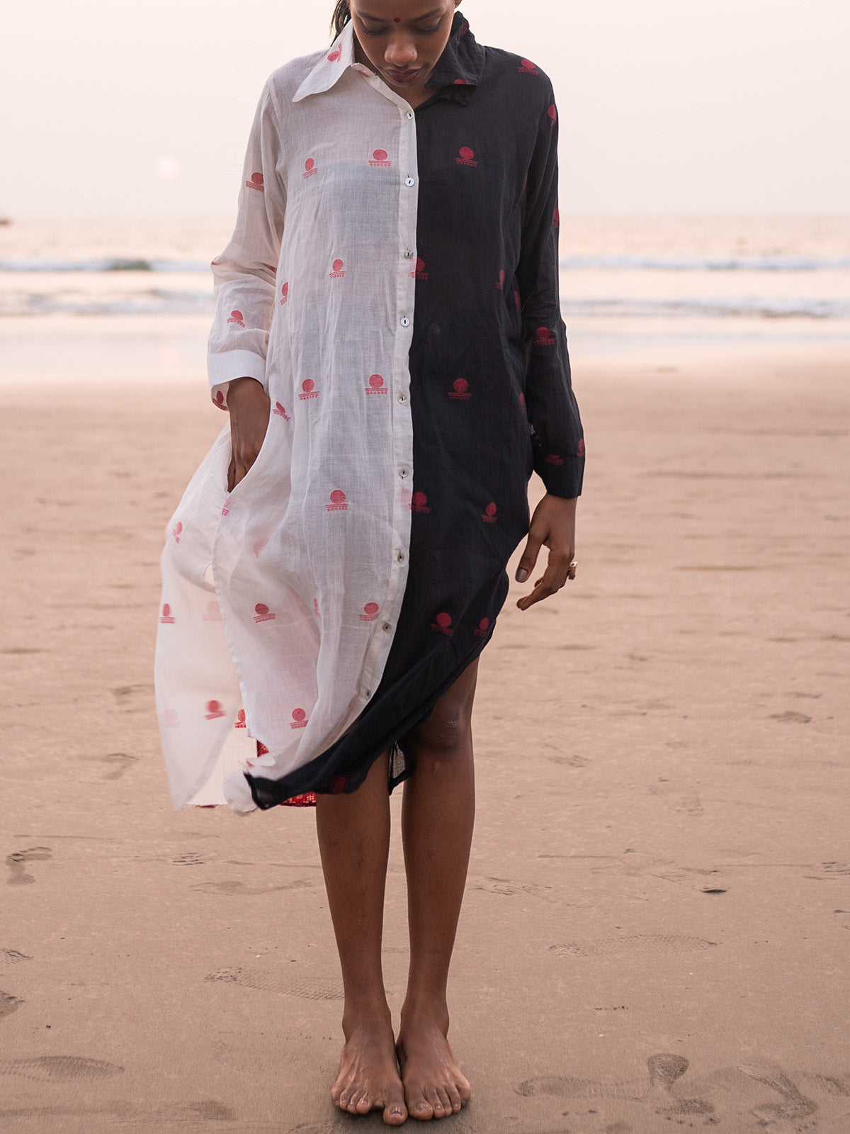 Elevate your style with the half-and-half jamdani shirt dress, a blend of casual elegance and comfort. Crafted from Prathaa's signature Red Bindi handloom cotton, it features a sheer jamdani weave and a playful maroon kantha handblock printed fabric box pleat at the back. Experience effortless chic in this loose-fitting, easy-flowing maxi dress.