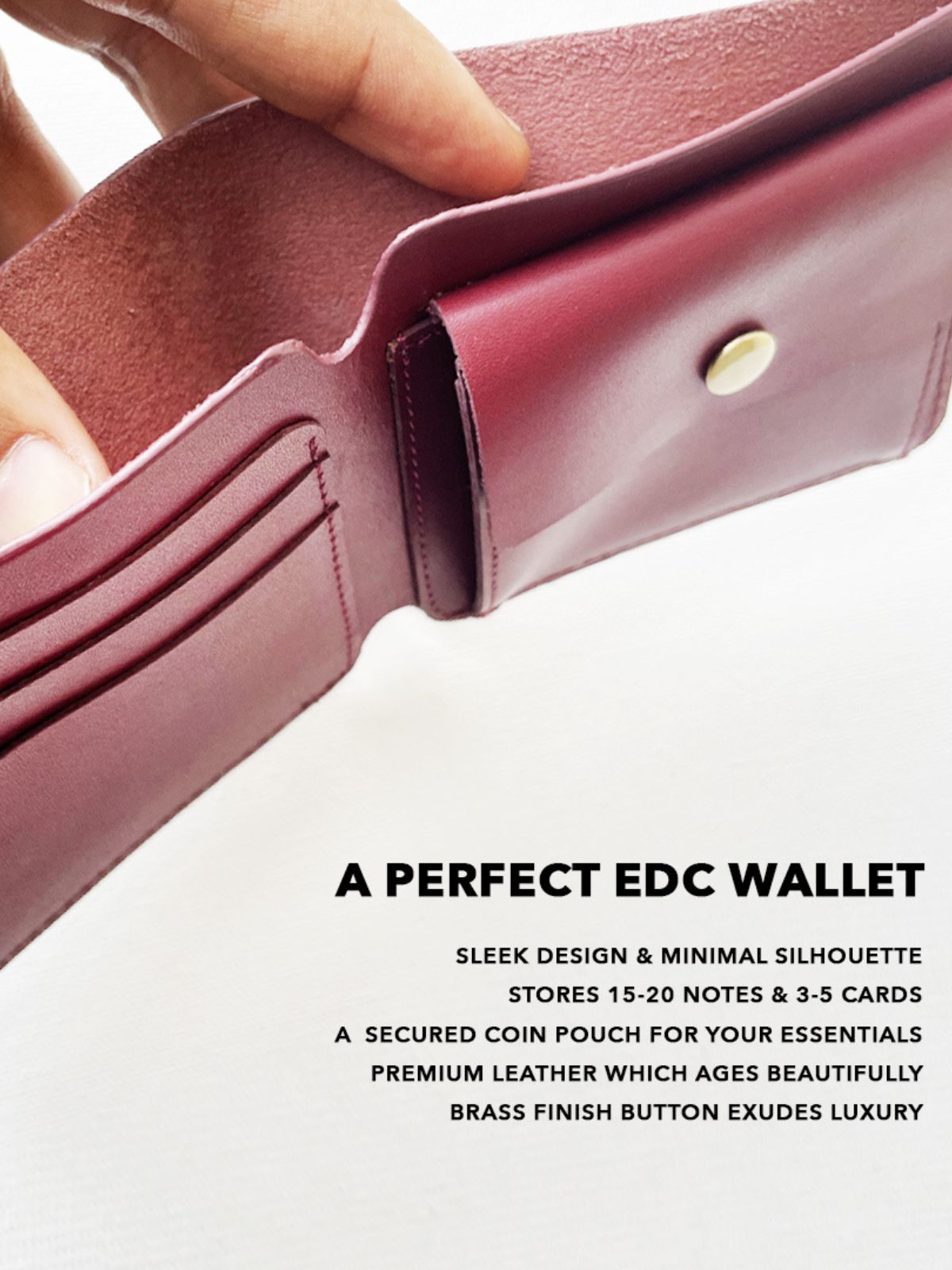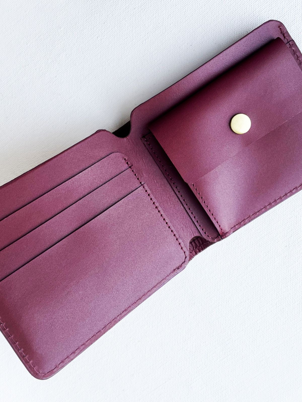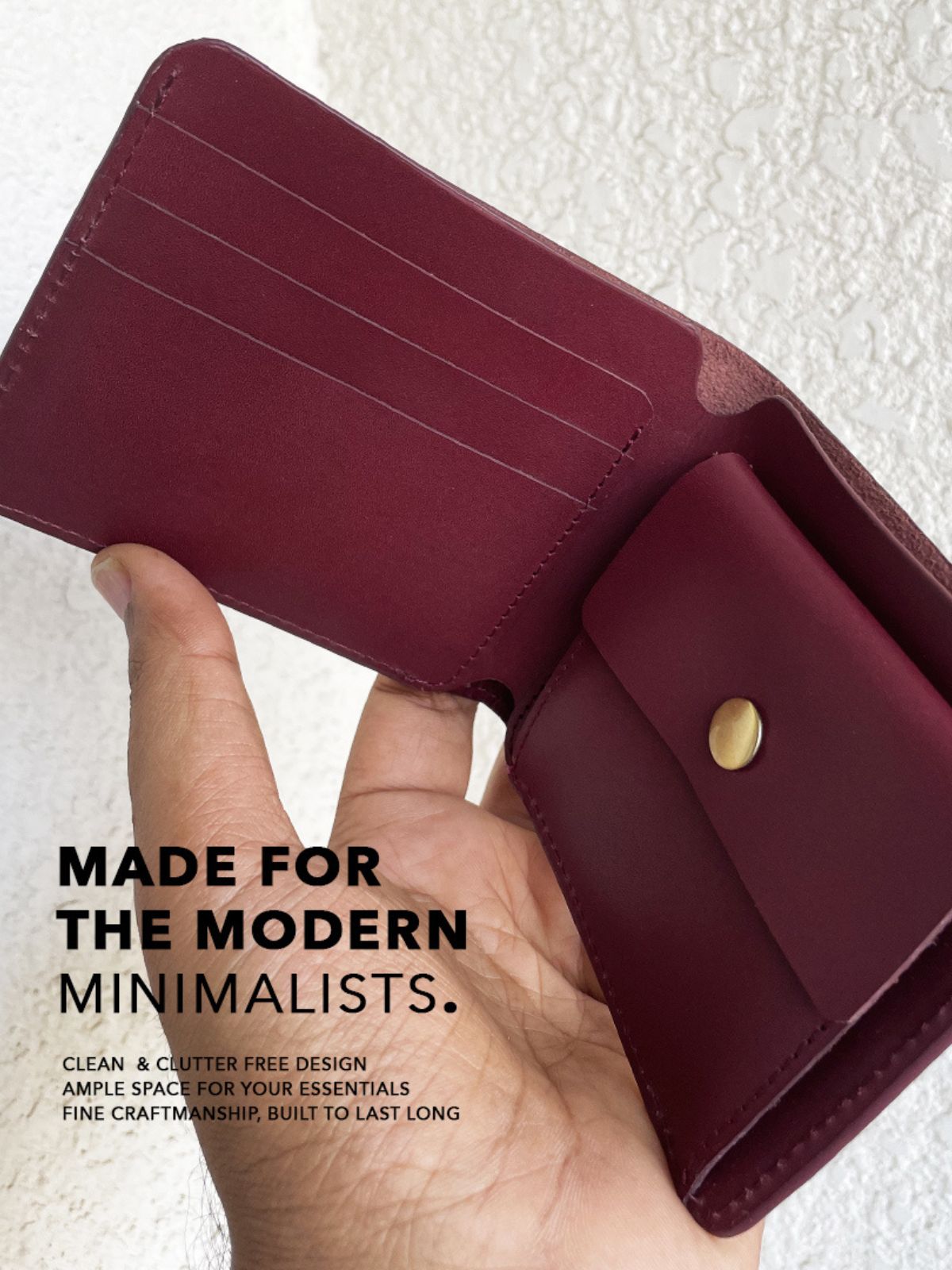 Handcrafted Burgundy bifold wallet in genuine leather, featuring a secured coin pouch for coins, SIM, or memory cards. Slim, functional, and lightweight, it provides portable organization while maintaining a minimalist, refined aesthetic. Perfect for modern travelers, it combines everyday practicality with sophisticated style, making it ideal for both casual and professional use.