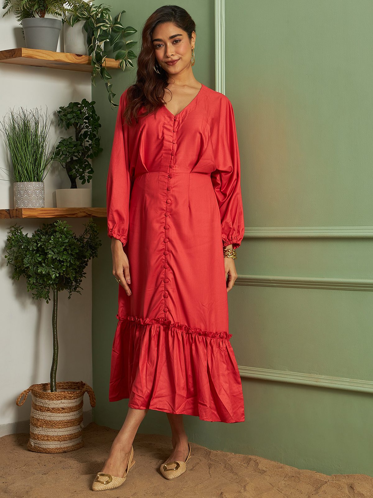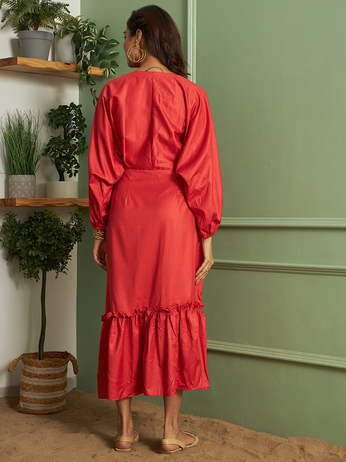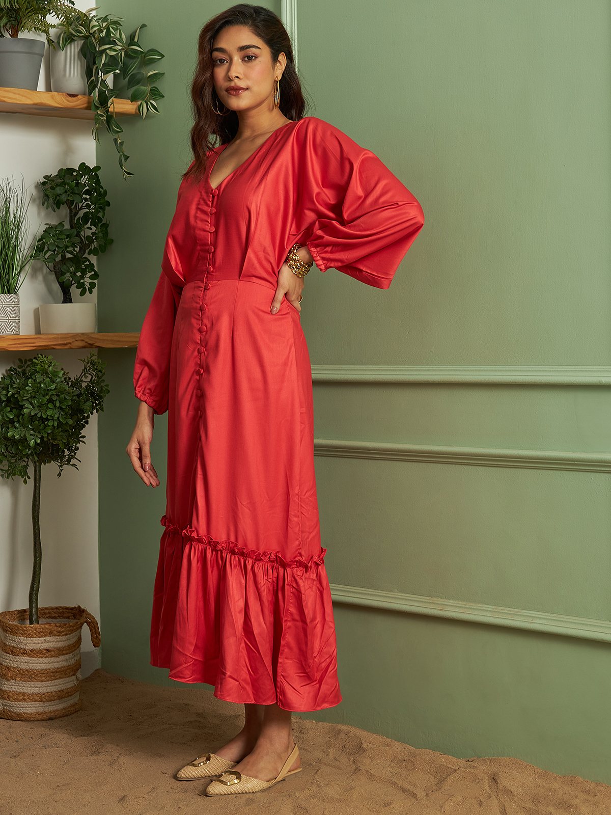 Elegant and vibrant, this long red dress captures timeless beauty with a contemporary edge. Puffy sleeves add volume and charm, while gentle gathering at the hem brings flow and ease to the silhouette. Finished with self-fabric buttons, it’s effortlessly graceful from top to bottom.