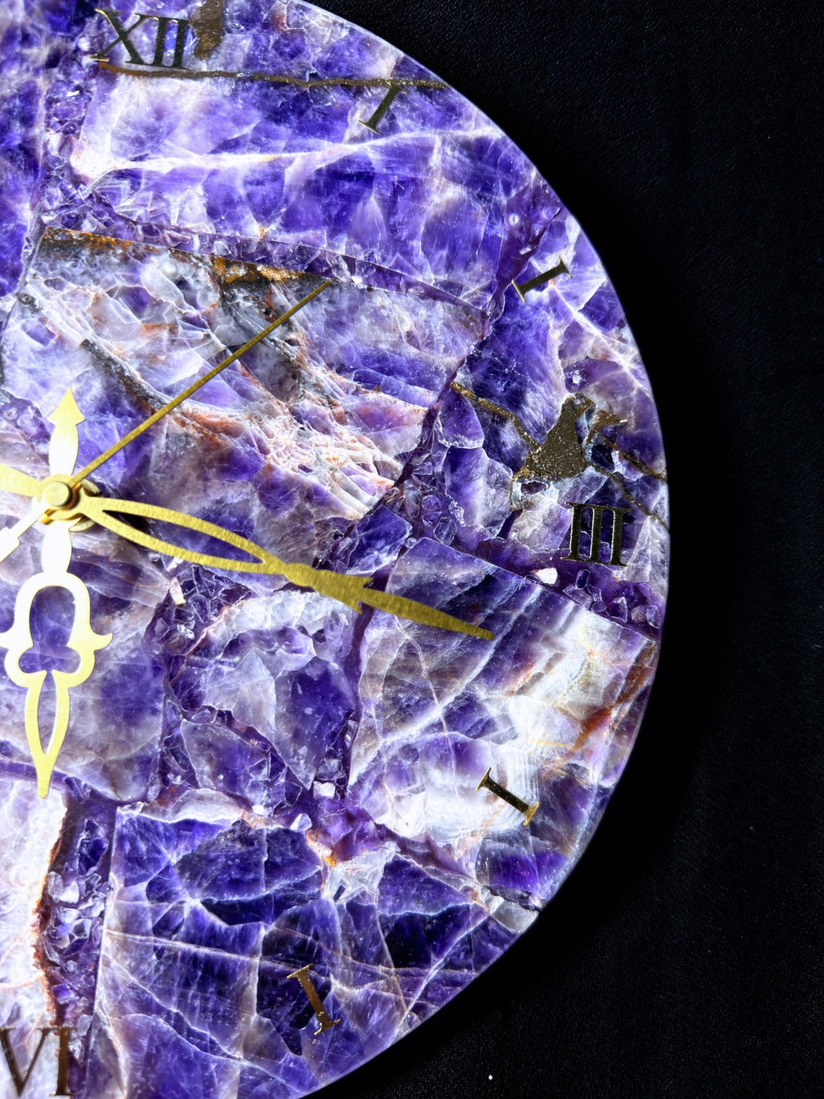 A radiant timepiece carved from Amethyst, this round wall clock blends form and function with spiritual elegance. Amethyst is known to promote peace and intuition—ideal for intentional living spaces and wellness corners.