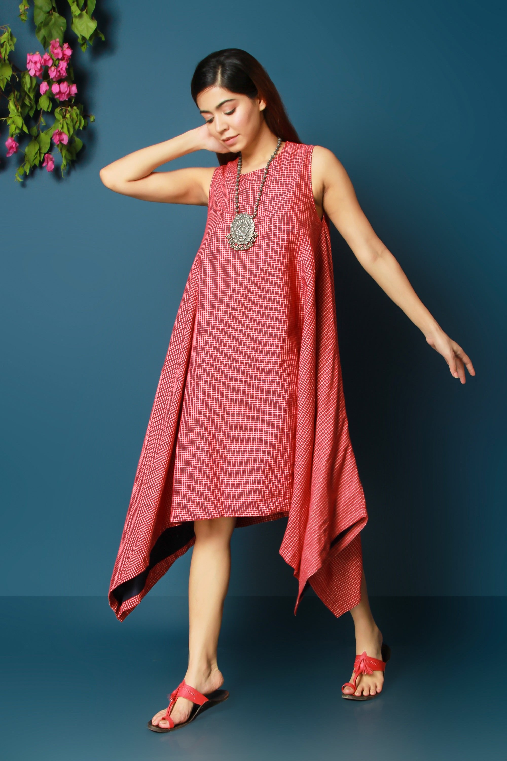 This Anna dress in pure cotton fabric is synonymous with summer. It comes with a high low asymmetrical hemline.In gingham checks and contrast layering from the inside. It is sleeveless and has pockets.