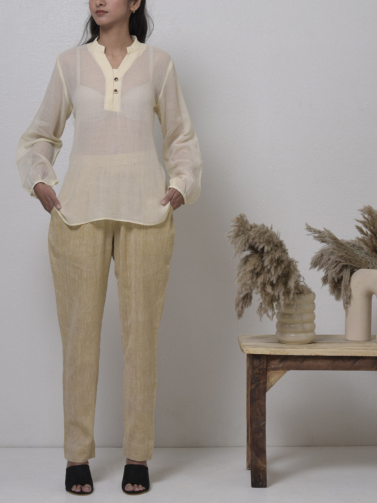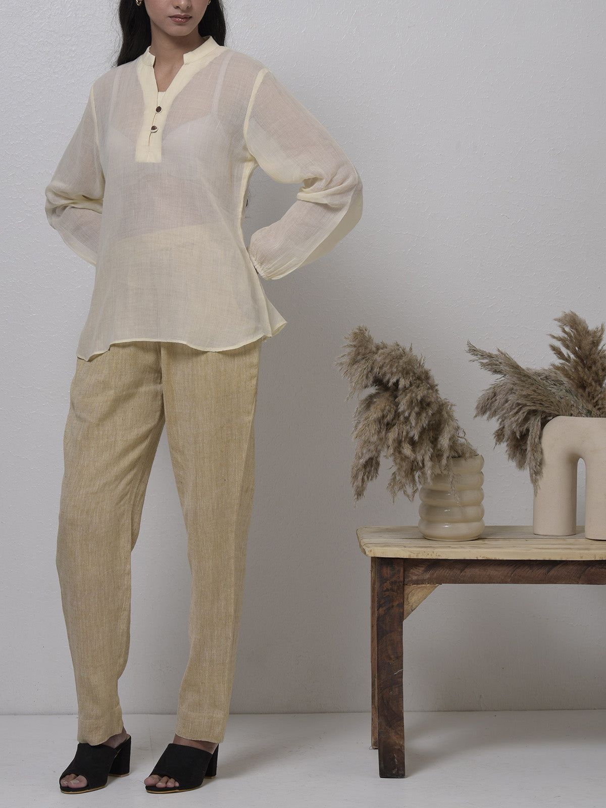 Embrace a touch of class and elegance with our full sleeve top featuring gathers on the sleeves. Crafted from beige cotton, this shirt offers a loose fit that exudes a dreamy charm. The relaxed silhouette adds an effortless and comfortable appeal, making it a versatile staple for the season. Whether you're dressing up for a formal occasion or opting for a more casual look, this top effortlessly elevates your style.