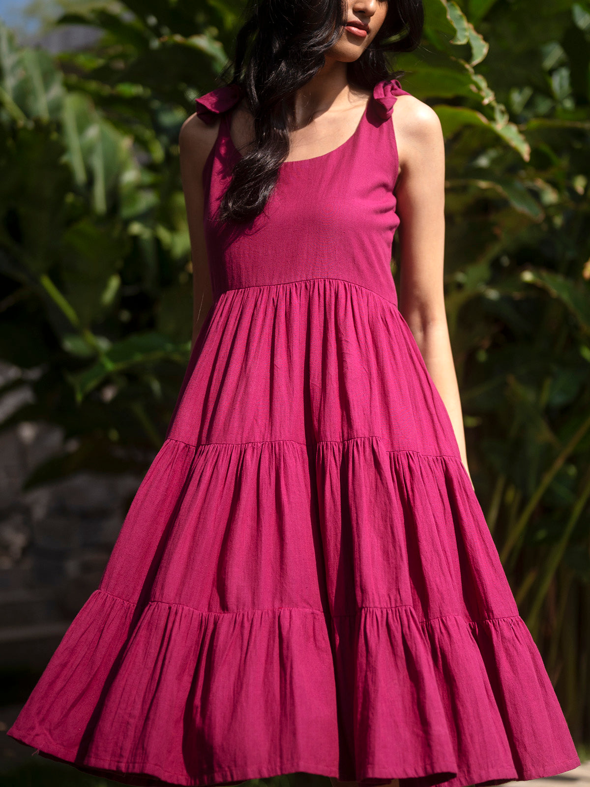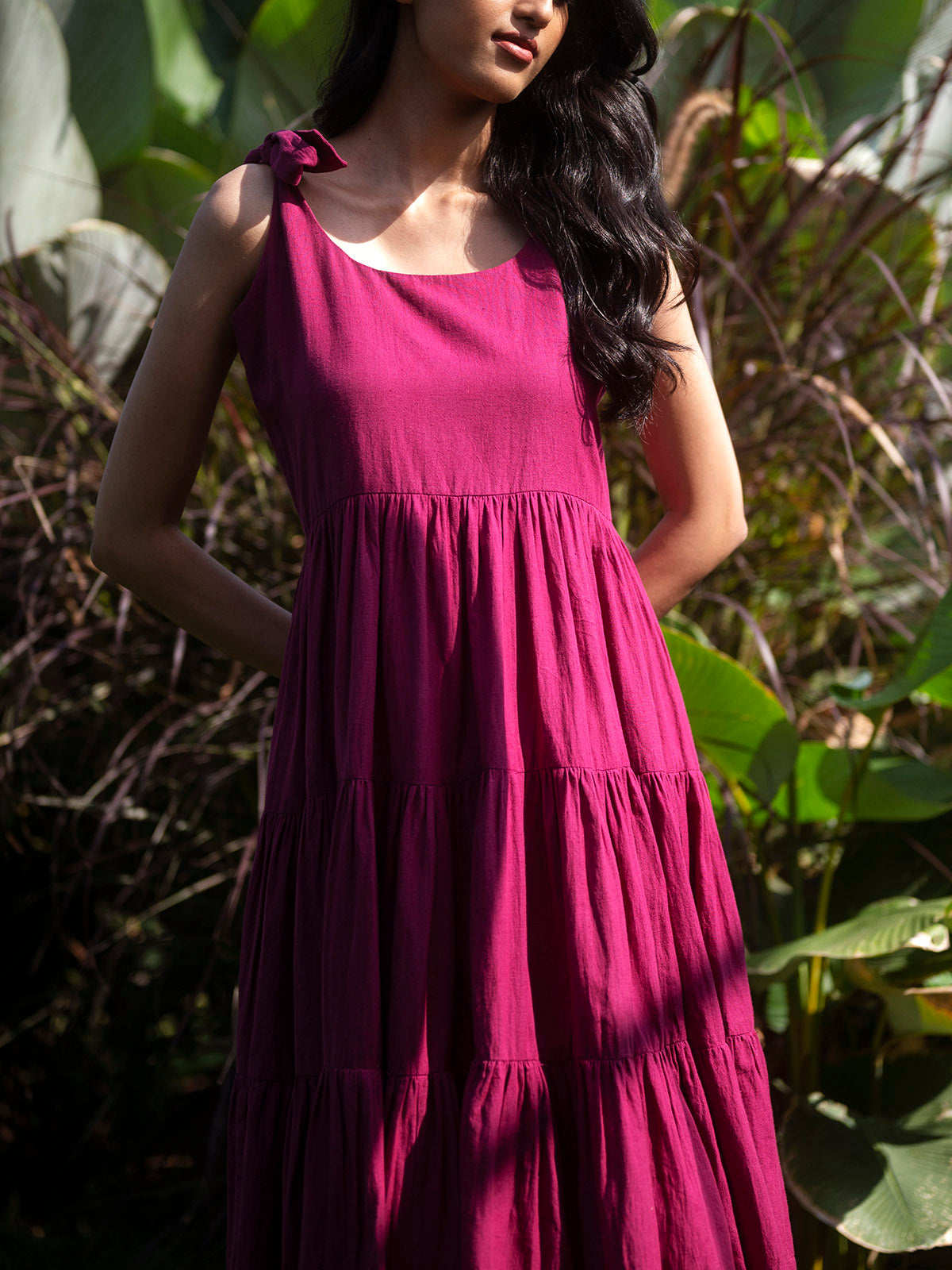 Step into the realm of elevated summer fashion with this reimagined tie-up shoulder dress and matching stole. The dress, crafted from soft rani pink cotton, features a scrunch waist and layers that gracefully drape on the body, creating a dreamy silhouette. With its regular fit and stunning design, it exudes both comfort and style.
