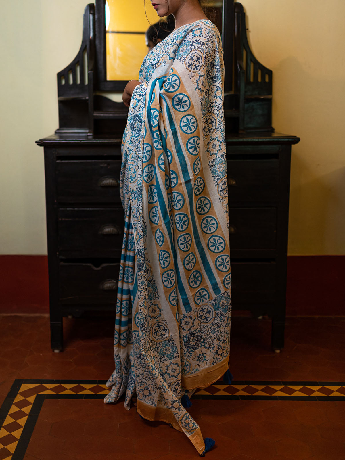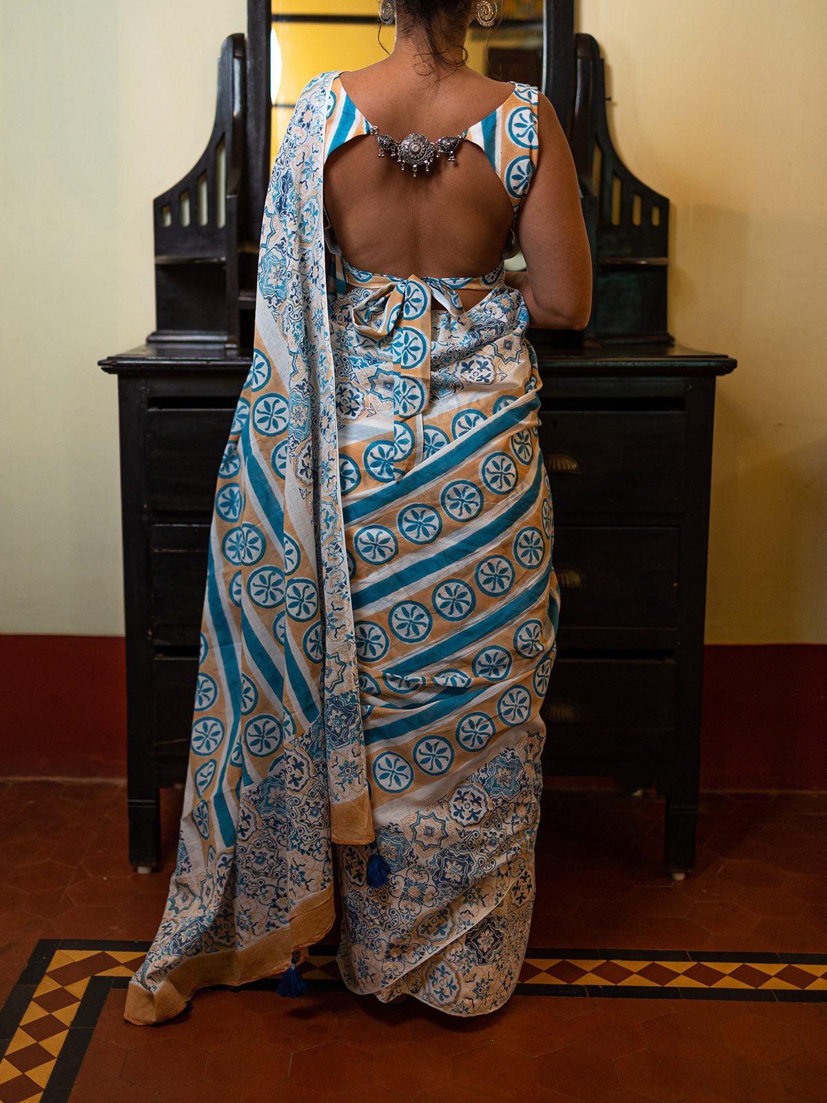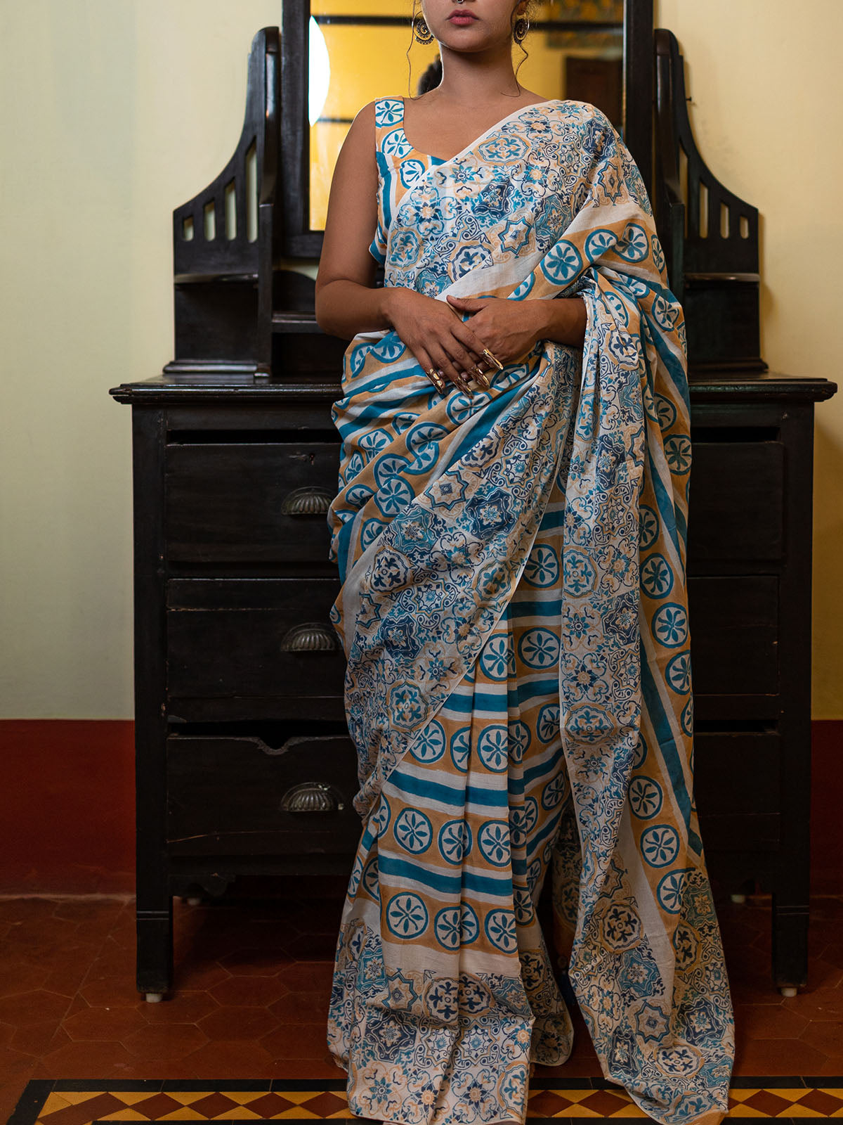 Indulge in the timeless elegance of our Azulejo Blue Mul Saree, inspired by the intricate hand-painted ceramic tiles of Goan architecture. Crafted in comfortable mul cotton, it features a striking combination of dark blue, light blue, and beige hues. The saree is a testament to our artisans' love and precision in hand-dyeing and hand-block printing techniques, ensuring every piece is unique with slight imperfections that add to its charm.