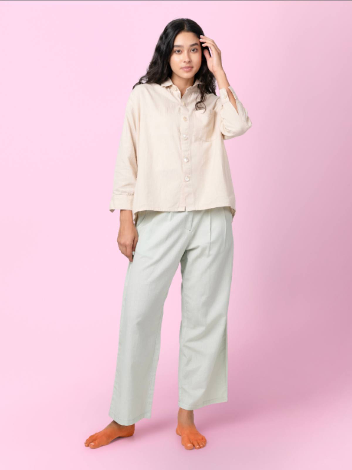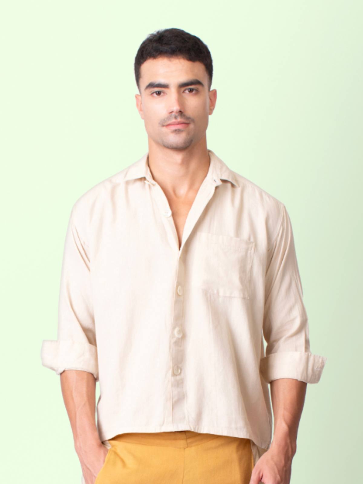 Crafted from soft, breathable fabric, this shirt offers all-day comfort for any occasion. The relaxed drop shoulders and cuffed full sleeves ensure easy movement, while a classic shirt collar and sea shell buttons add a thoughtful, stylish touch. An asymmetrical hem brings a cool, unexpected edge, and a subtle embroidered patch at the back adds quiet personality.