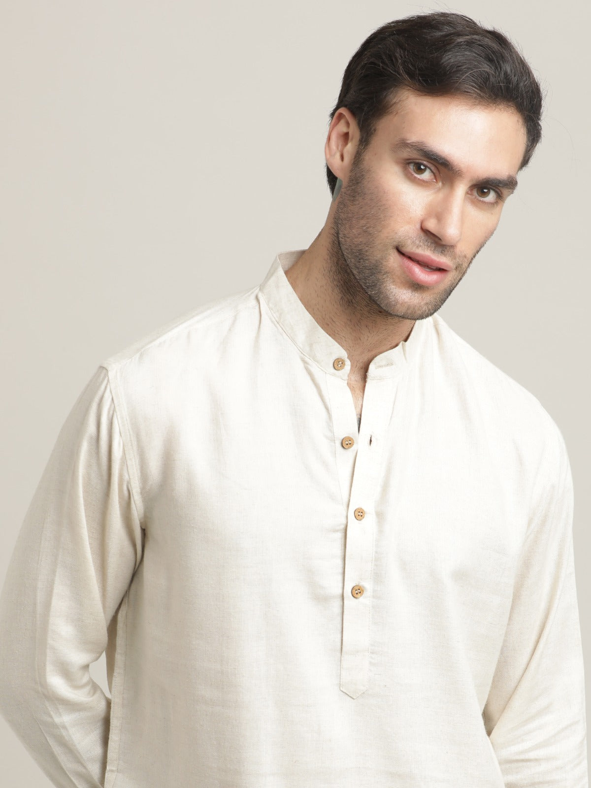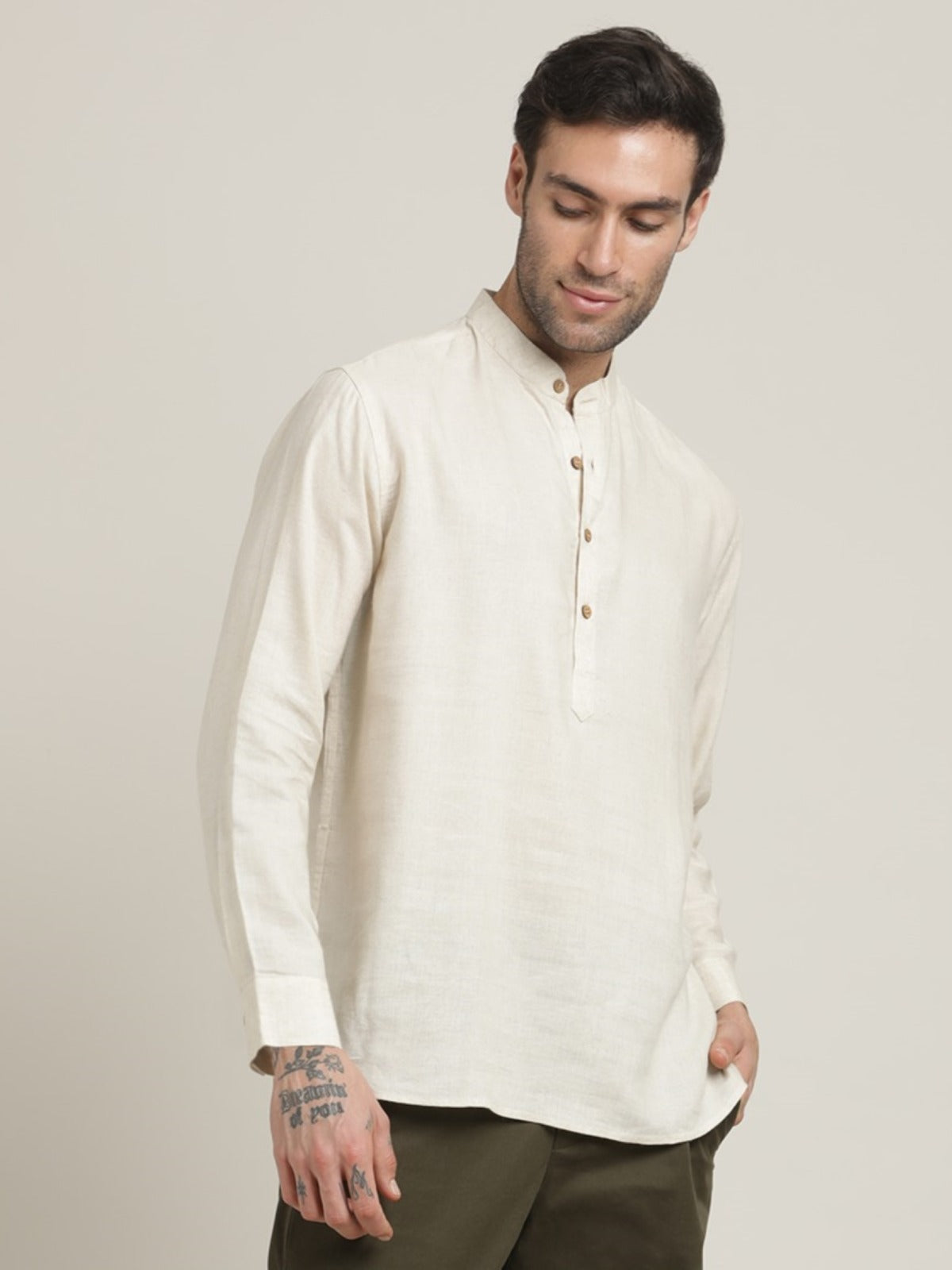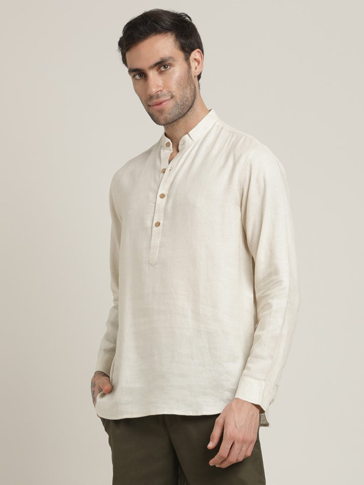 A shirt that finds the sweet spot between structure and ease - minimal, functional, and refined for all-day versatility. Relaxed fit with gentle drape for a clean silhouette. Full sleeve with square cuffs and 2-button adjustability. Mandarin collar for a smart, unfussy neckline. Modified popover diamond neck placket for a contemporary touch. Horizontal back yoke with a logo patch at the centre back.