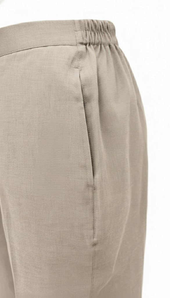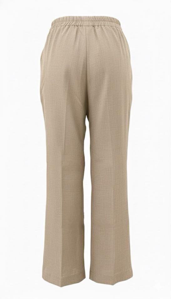 Crafted from a comfortable Cotton-Linen blend, these essential trousers feature a versatile warm beige hue. They offer a flattering straight-leg, slightly flared silhouette and are designed with a clean, high-rise waist. This streamlined look creates a polished foundation, making them an ideal staple for both professional and elegant casual styling.