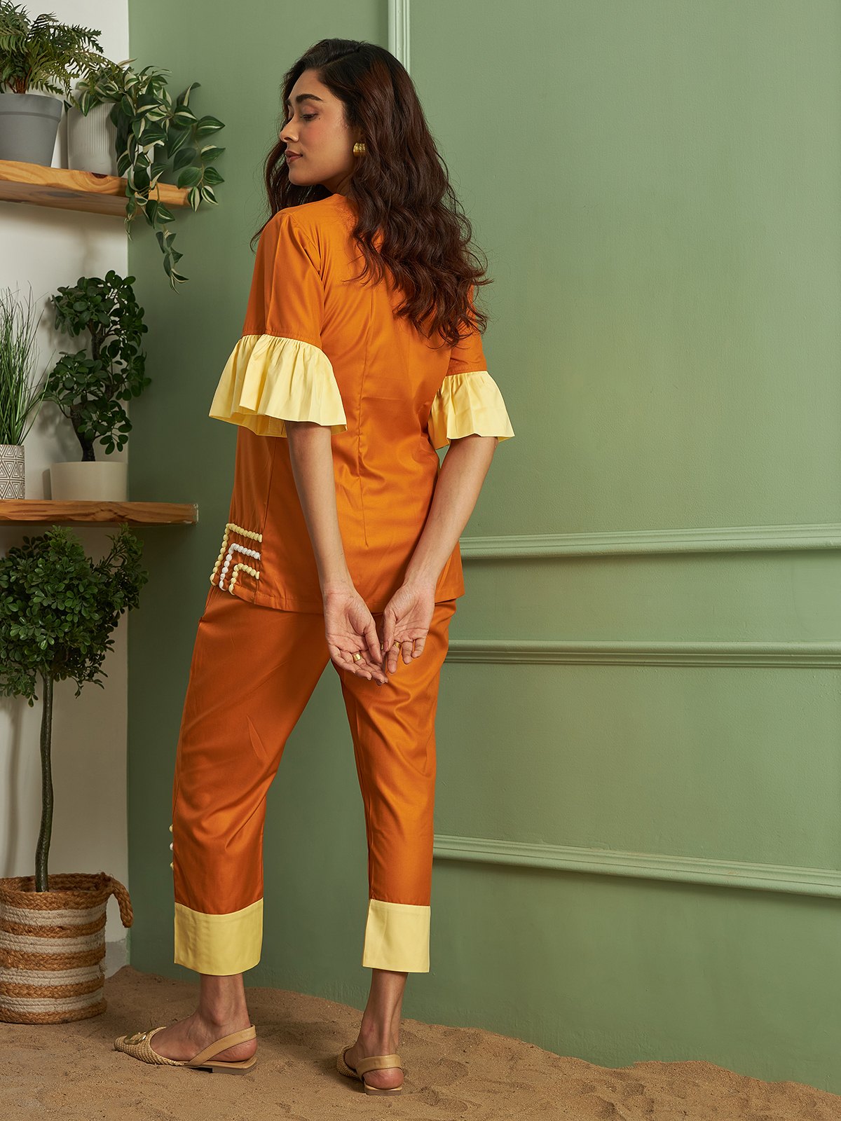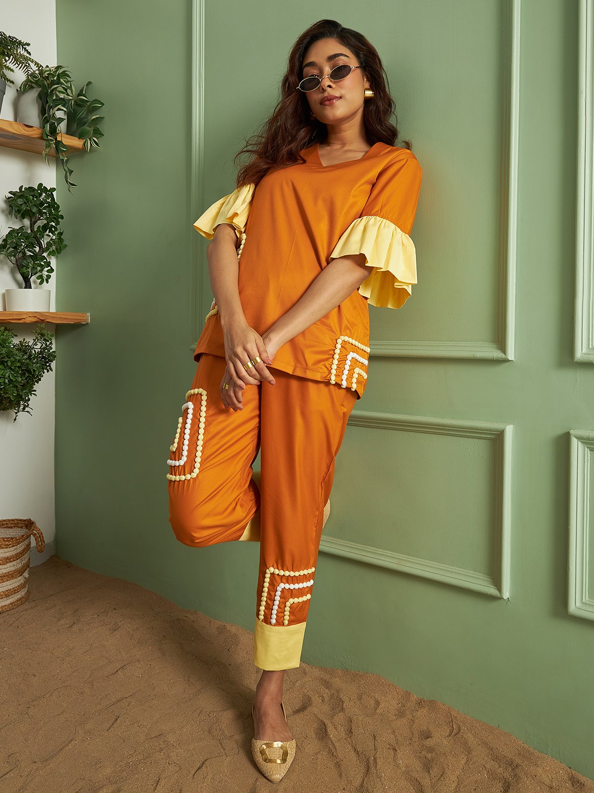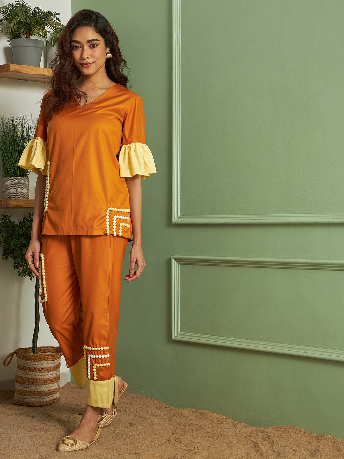 A vibrant tan and yellow co-ord set featuring a top and pants finished with playful white and yellow pom-pom detailing — fun, bold, and perfect for sunny days.