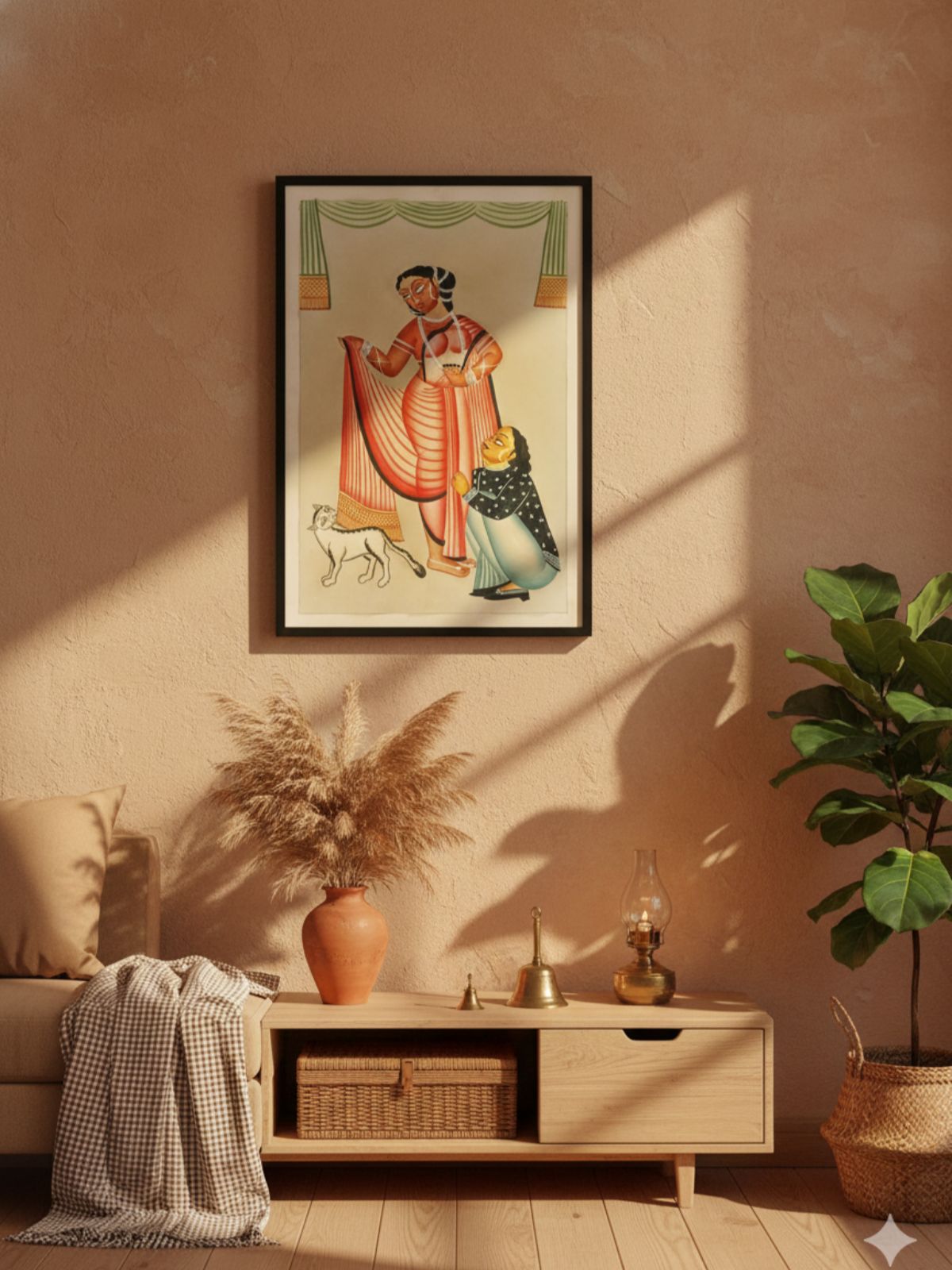 A depiction of Bibi returning to her maternal home after marriage, surrounded by emotions of nostalgia and joy. Painted with Pattachitra detailing on grass-textured handmade paper, the scene uses natural color tones to express cultural sentiments passed down through generations. This artwork celebrates memories, relationships and the emotional journey of womanhood.