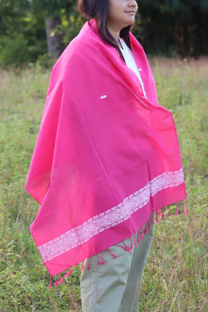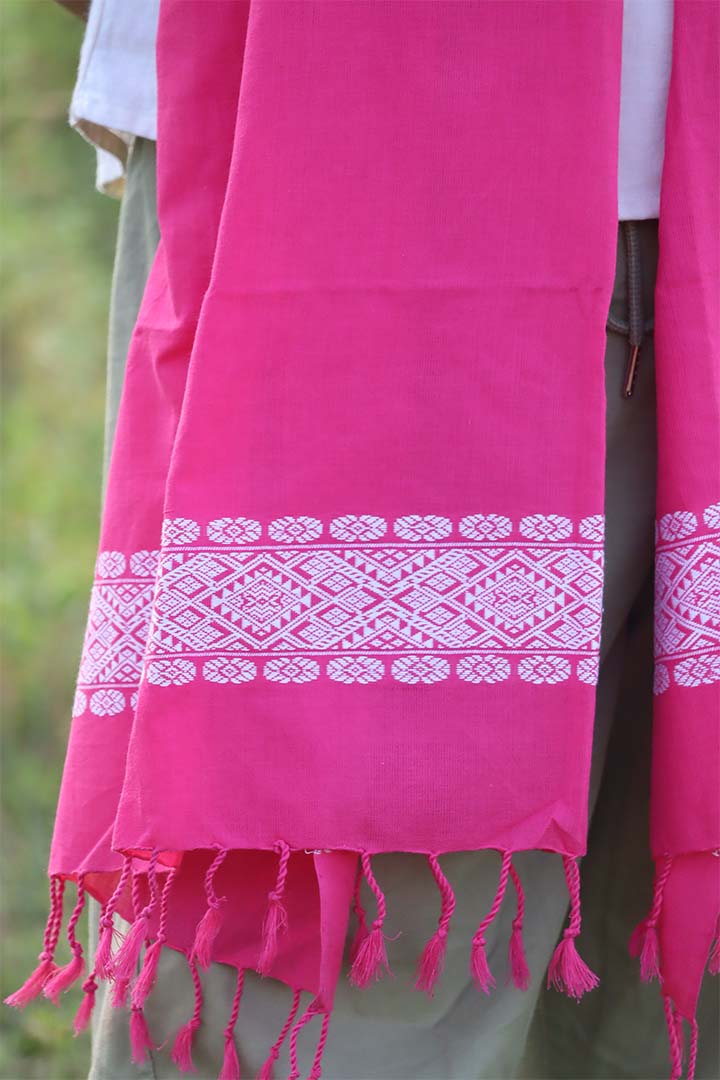 This is a Pink solid pattern stole, traditionally handwoven by the Mising tribe women in Majuli. the motifs are usually inspired by the local flora, fauna & landscape imitating the flowers, ferns, trees, butterflies, animals, birds, and waterbodies. Traditional looms in Majuli are manual, throw shuttle looms. The motifs are manually inserted using the extra weft technique which is almost like embroidery on the loom.