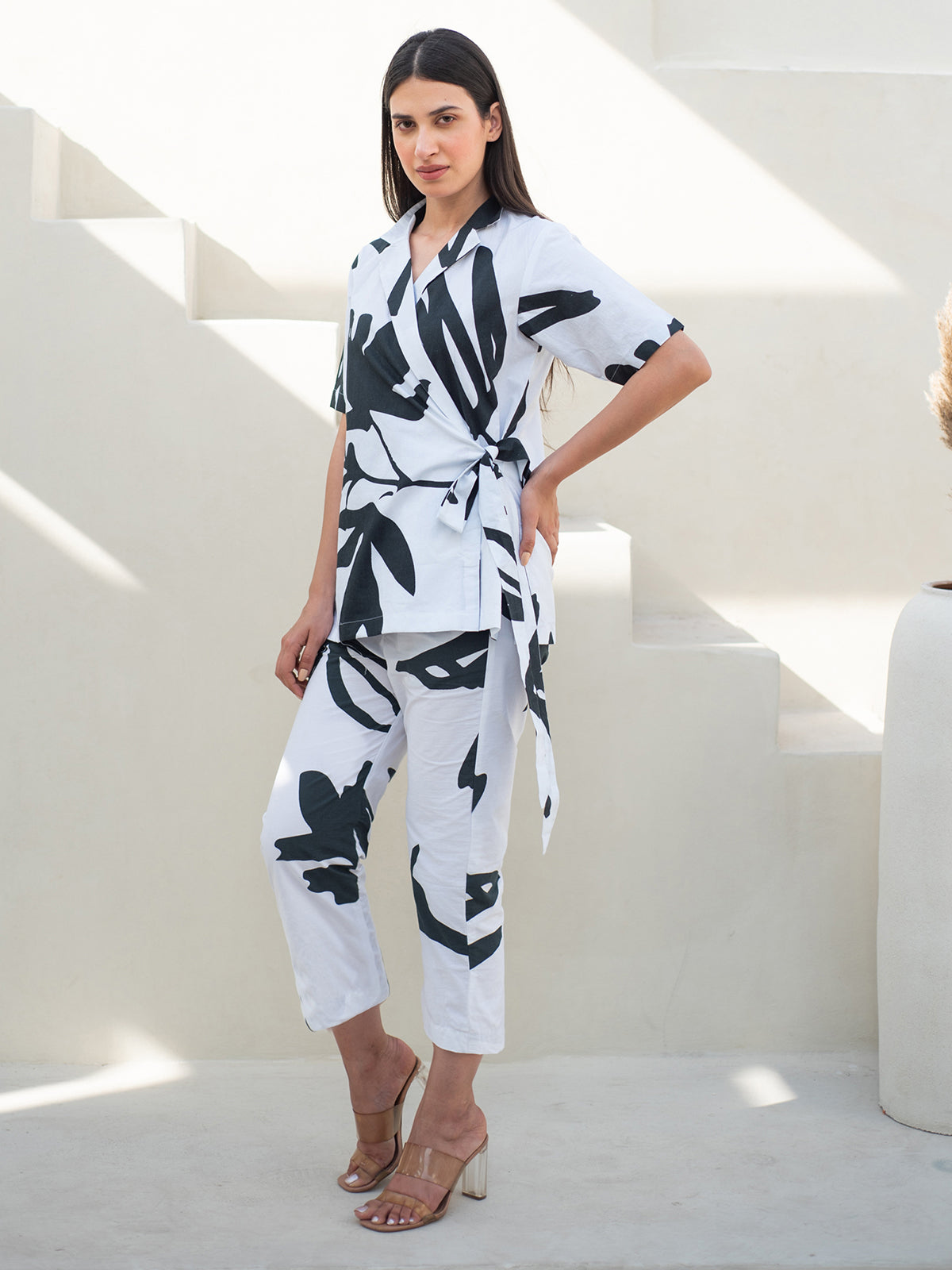 This striking two-piece set features a black and white printed cotton jacket paired with matching pants. The jacket showcases a smart collar overlap neckline and half sleeves, while the pants offer comfort with a fully elasticated waist and side pockets — a modern fusion of bold aesthetics and relaxed tailoring.