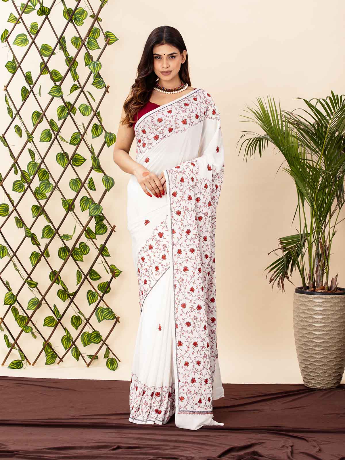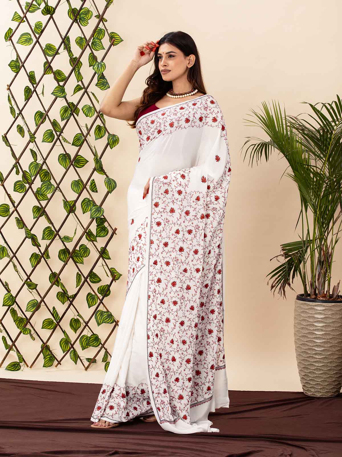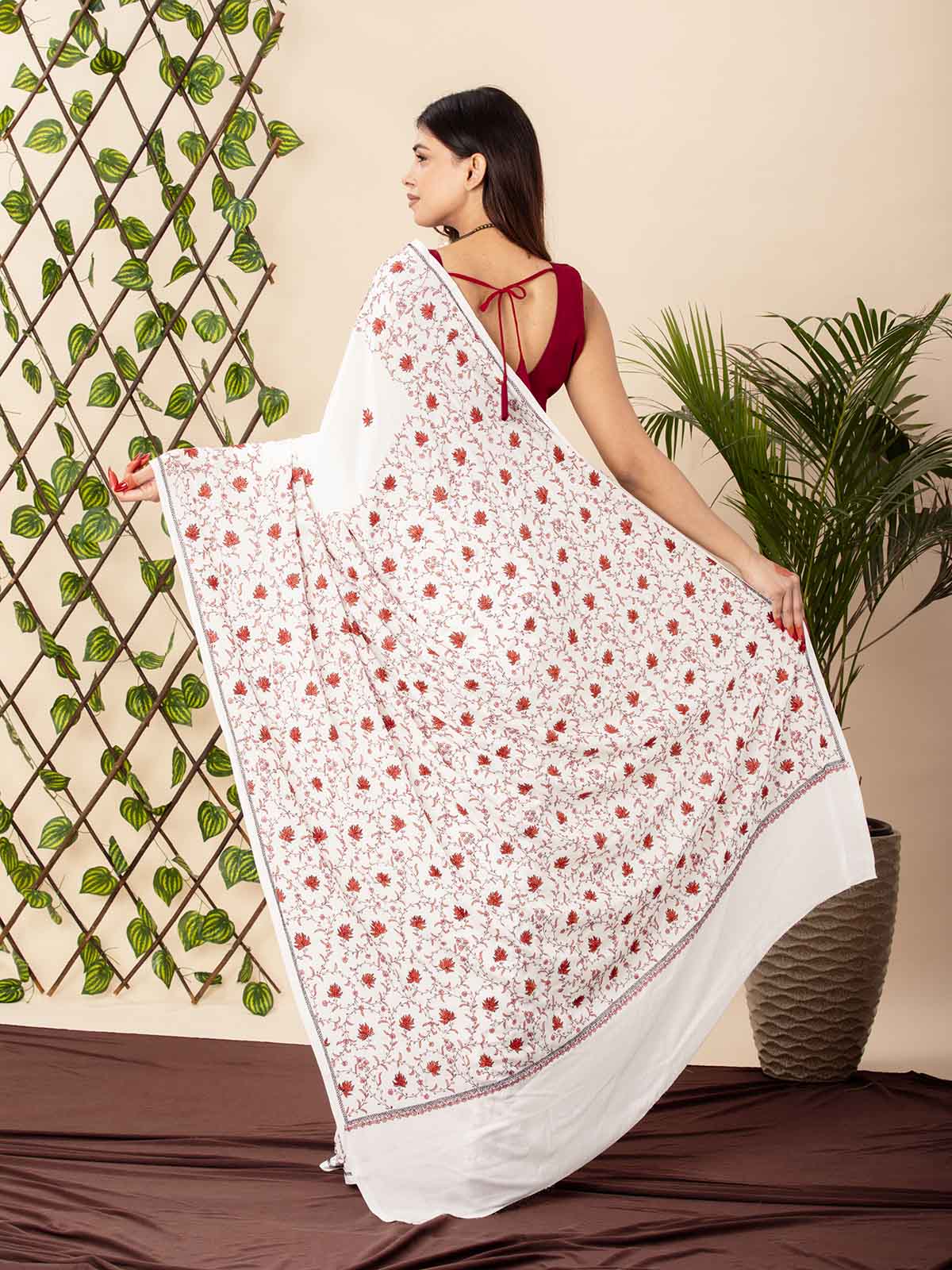 Ethereal and rooted in tradition, this Ivory Khadi Cotton Saree speaks the language of elegance. The soft, breathable khadi base is beautifully adorned with intricate red sozni-style embroidery, adding a rich, artisanal charm.The detailed floral motifs and delicate borders reflect timeless craftsmanship — perfect for those who appreciate subtle yet statement-making attire. Comes with a coordinated blouse piece to complete the look.A graceful ode to minimalism, tradition, and slow fashion.
