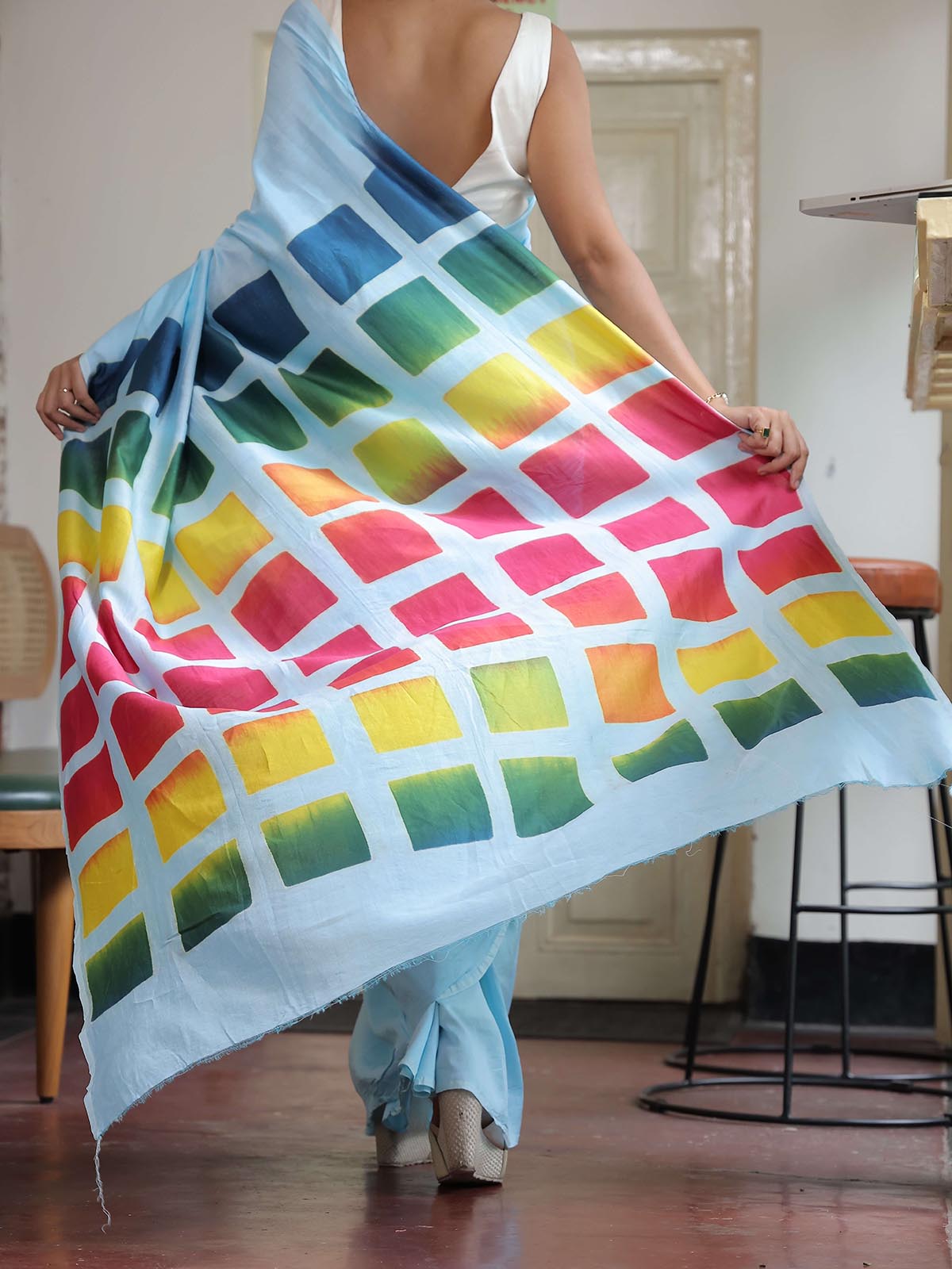 Chanderi Saree in turquoise blue with a geometric pattern on pallu made using clamp dyeing technique. Clamp Dyeing uses wooden blocks to create bold, symmetrical designs that creates eye catching patterns. These techniques create sarees that are versatile and effortlessly stylish, perfect for any occasion.