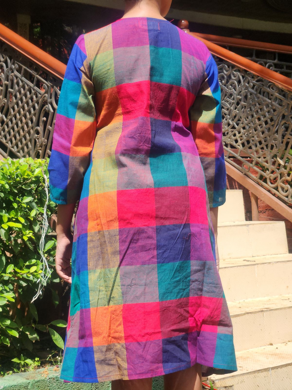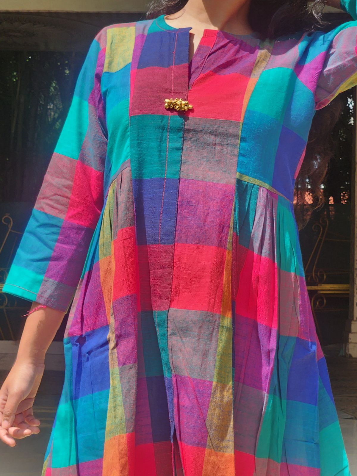 Crafted in hand-woven checks, this flare dress features softly gathered side panels that create fluid movement. Ghungroo detailing at the neckline offers a delicate chime and festive sparkle. Finished with a practical pocket, it balances everyday ease with artisanal charm for occasions that call for quiet celebration.