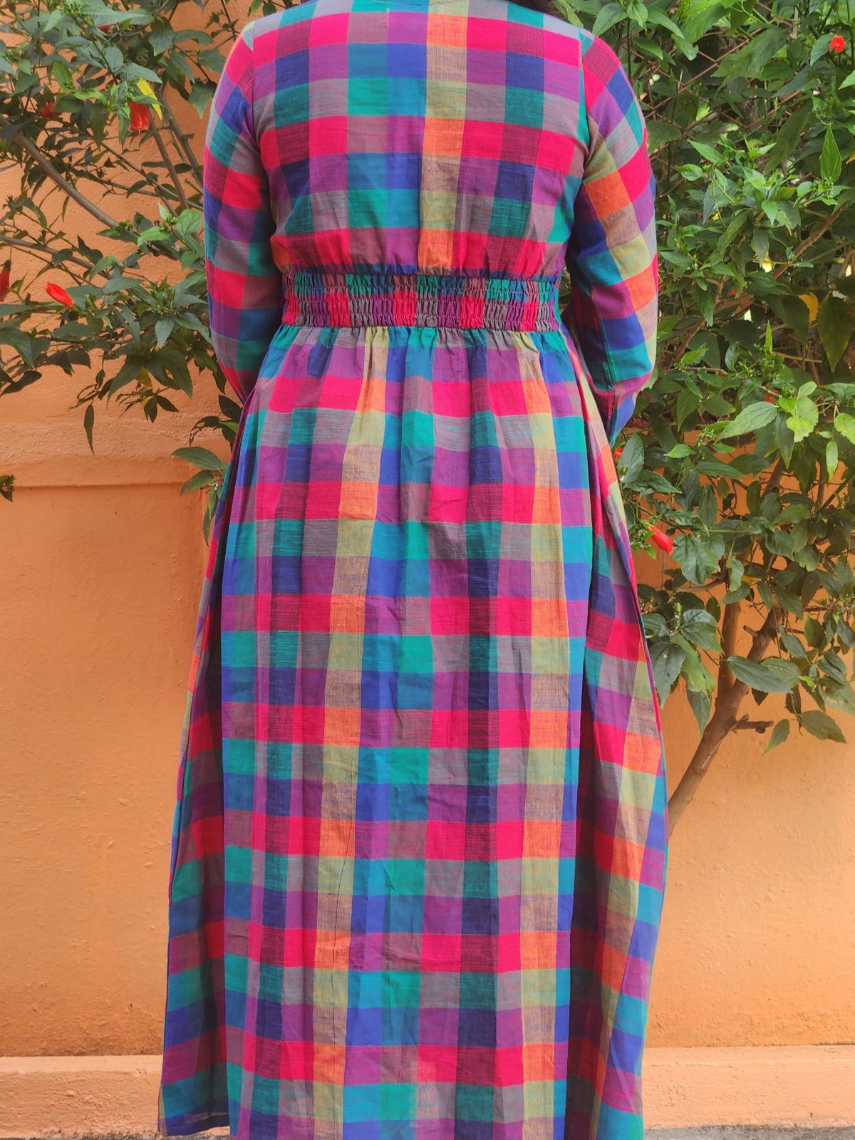 This calf-skimming silhouette in blue checks features a V-neck, three-quarter sleeves, and a waist belt that shapes without constricting. With a handy pocket and soft, breathable handloom feel, it’s an instant day-to-dusk piece that honours craft while delivering everyday polish and movement.