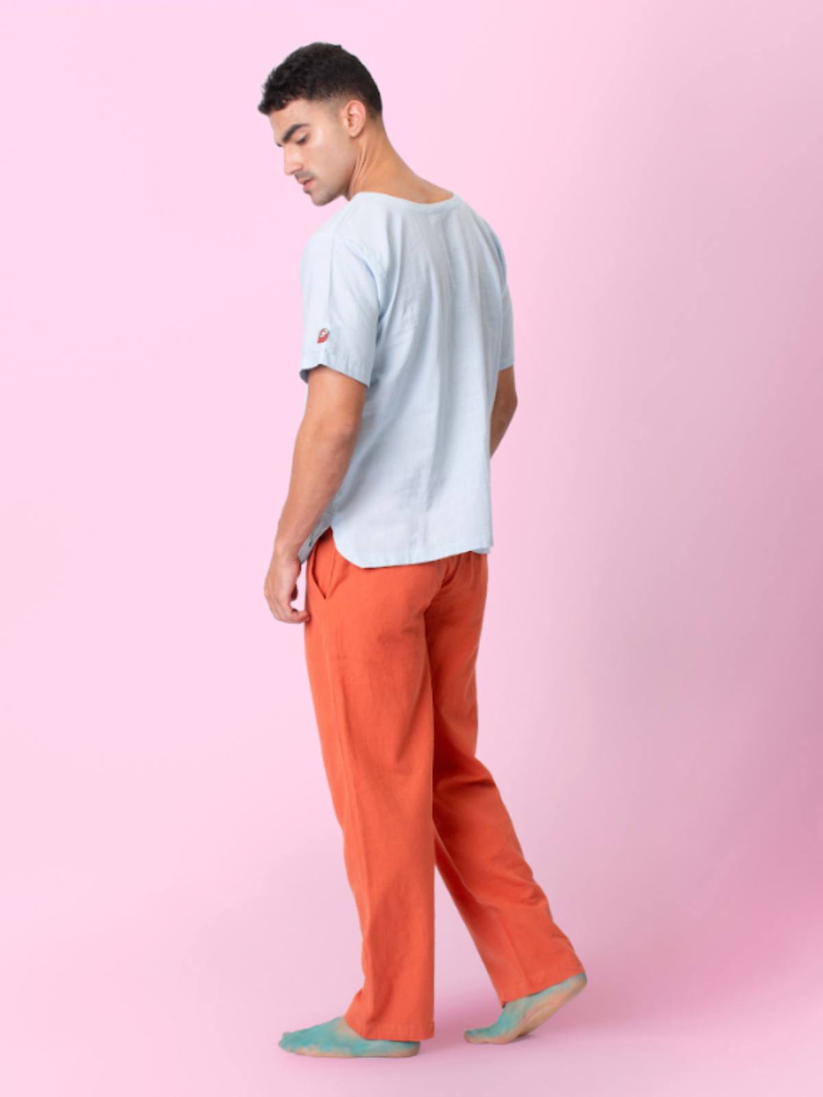 Features a classic round neck, half sleeves, and a functional kangaroo pocket. The rounded hem adds a modern touch, while a unique embroidered patch on the sleeve brings subtle character. Perfect for everyday comfort and casual style.