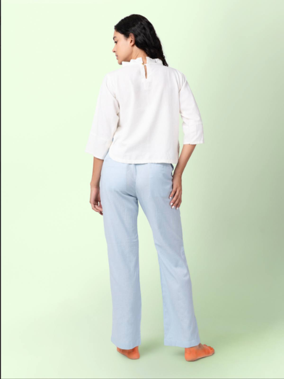 Designed for all-day ease, these relaxed-fit, full-length pants offer breathable comfort and effortless movement. The adjustable drawstring, front zip closure, and deep side pockets add function, while a delicately embroidered clover patch at the back brings a quiet artisanal flourish.