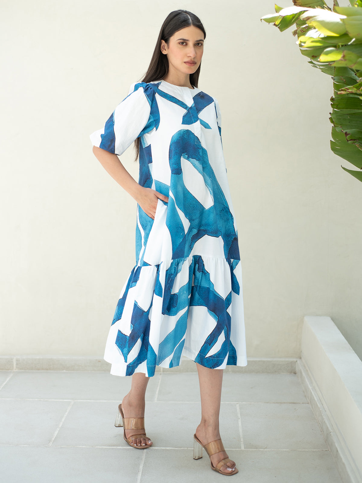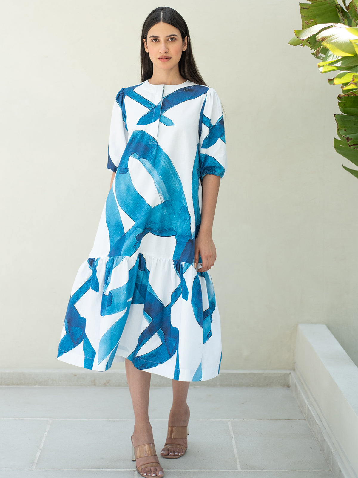 This striking bottom flare cotton dress showcases bold blue stroke prints in a digital finish, radiating modernity and poise. Crafted with a round neck and 3/4 sleeves, it offers a timeless cut, while the artistic pattern brings a fresh, expressive vibe.