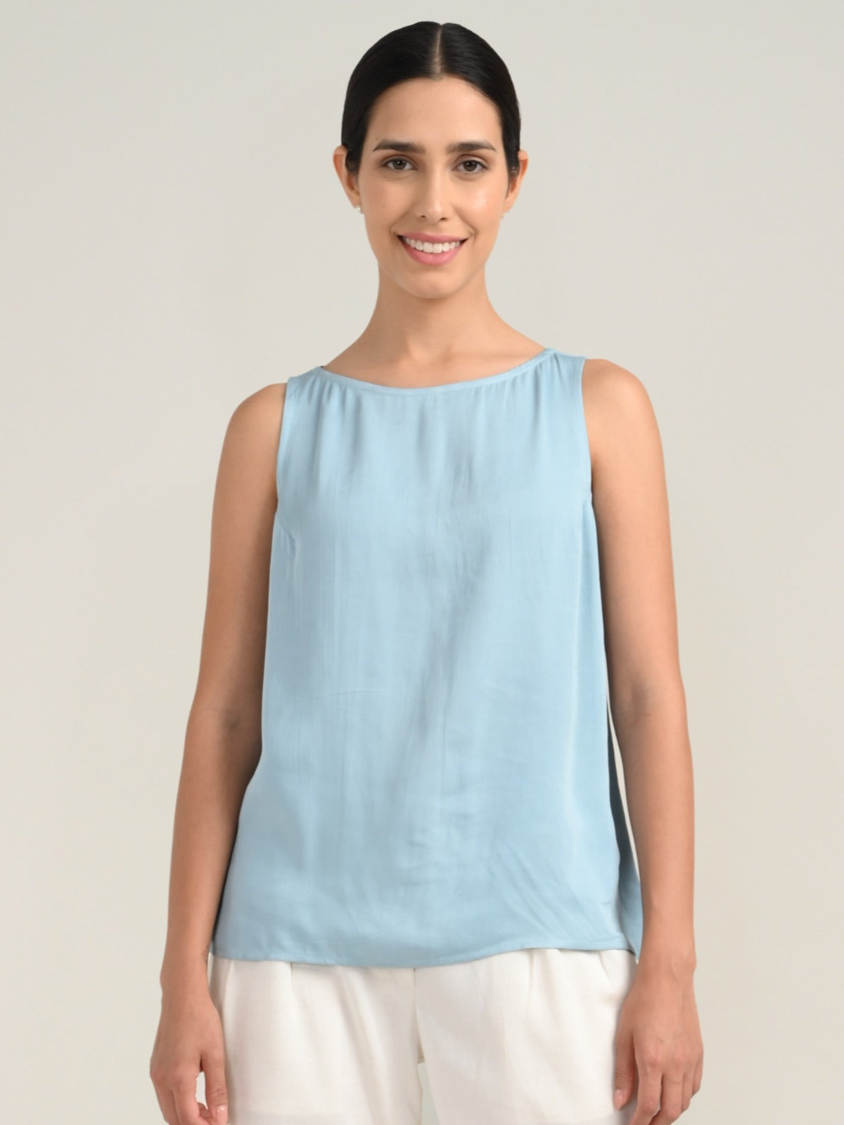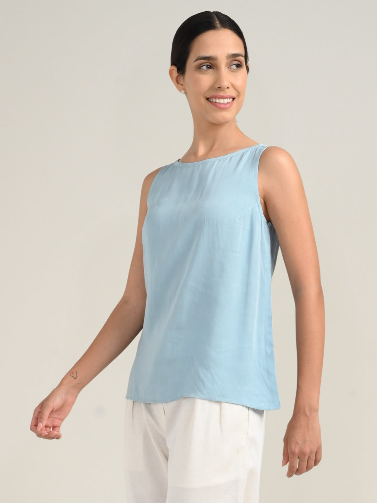 A timeless sleeveless Tencel boat neck top designed for effortless layering. Smooth, breathable, and eco-friendly, it slips on with ease—no zips, no fuss. Minimal seams and a fluid drape make it a versatile wardrobe essential, perfect for pairing with blazers, cardigans, or worn elegantly on its own.