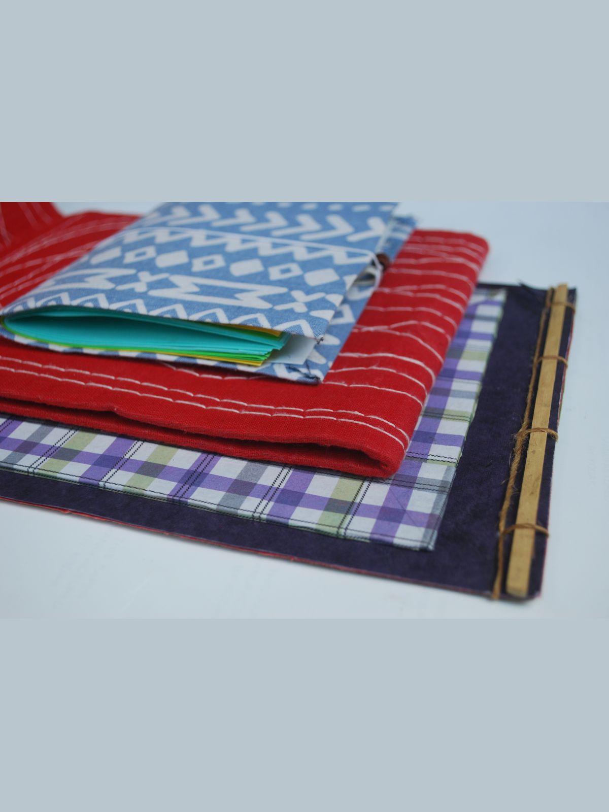 - In The Box: • Bahi Book cover • Papers for 3 notepads • Fabric cover • Awl • 3 x Threads • Glue • Needle • 2 x Binder clips • Ruler • Bamboo • Beads • Template strips